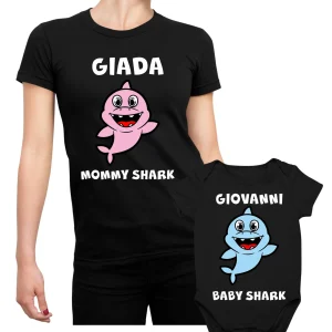 Coppia t-shirt e body neonato Festa della Mamma PERSONALIZZABILE Maglietta Mamma Figlio Mommy Shark Baby Shark – Idea Regalo Mamma