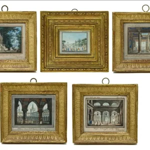 Alessandro Sanquirico (Milano, 1777- 1849), Quattro scene teatrali e una veduta di Milano