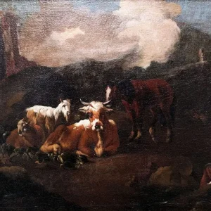 Ambito di Francesco Londonio, “Paesaggio con rovine armenti e pastori” olio su tela.