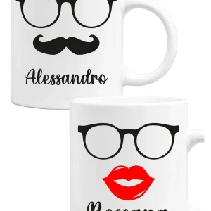 Coppia Tazze Mug Sanvalentino Personalizzabile Baffi Rossetto Personalizza con nome Amore Innamorati Fidanzati Regalo Lui e Lei