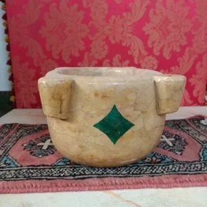 Mortaio da farmacia in marmo nembro intarsiato in marmo verde