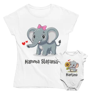 COLORFAMILY Coppia T-Shirt e Body PERSONALIZZABILE Elefantino Figlio Figlia Mamma Donna Neonato Festa della Mamma Maglietta manica corta Taglie dalla S alla XL e da 0 a 24 mesi