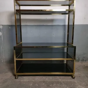 70s TV cabinet desk in brass and smoked glass Romeo Rega Willy Rizzo style