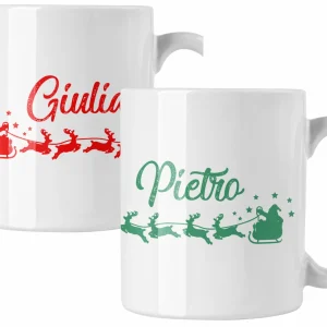 Coppia di tazze Natale Natalizia PERSONALIZZABILE con nome Slitta Renne Santa Claus Merry Christmas Mug 11 Oz Idea Regalo