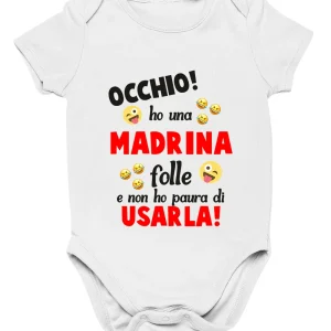 Body da neonato Occhio! ho una madrina folle e non ho paura di usarla – body simpatico e divertente – idea regalo
