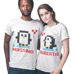 Coppia T-Shirt Magliette SanValentino PERSONALIZZABILI con nome Pinguini Arcade Vintage Gamer Love idea regalo