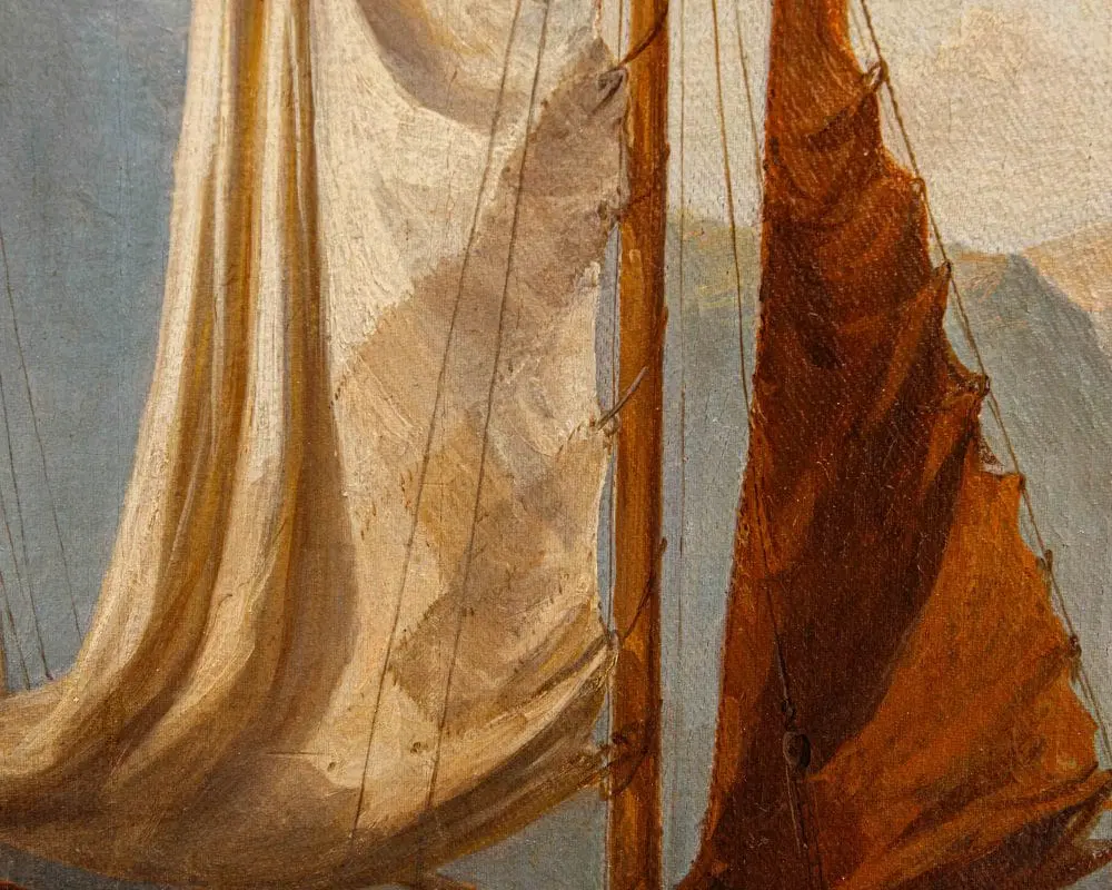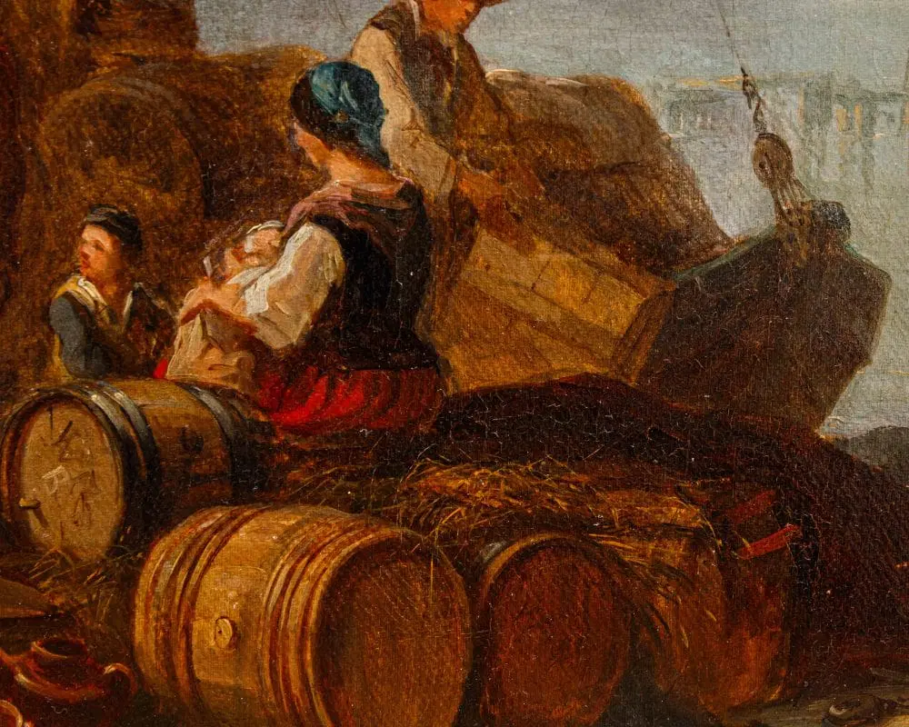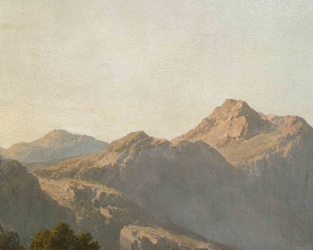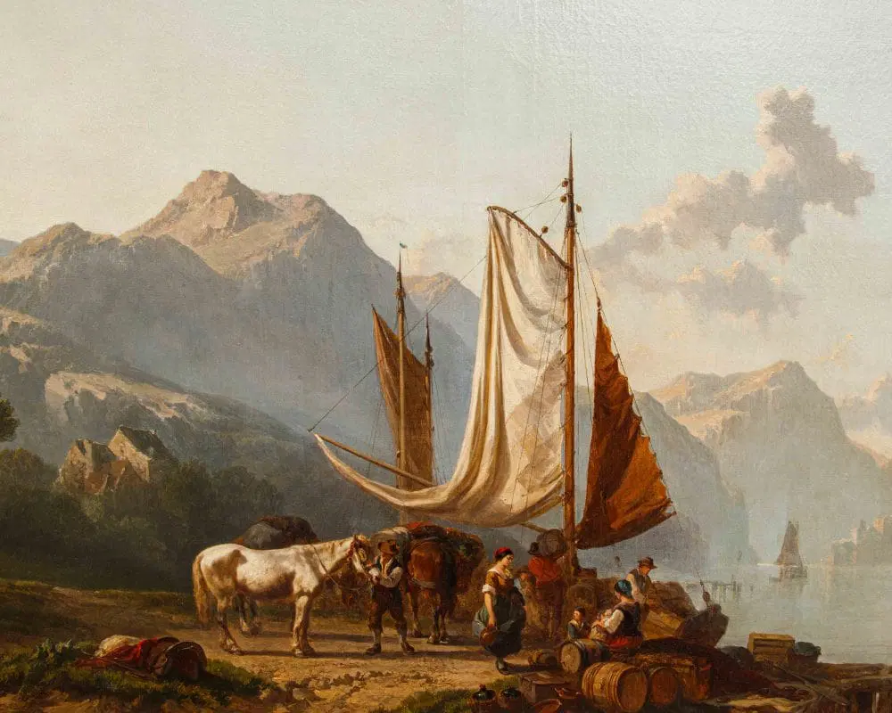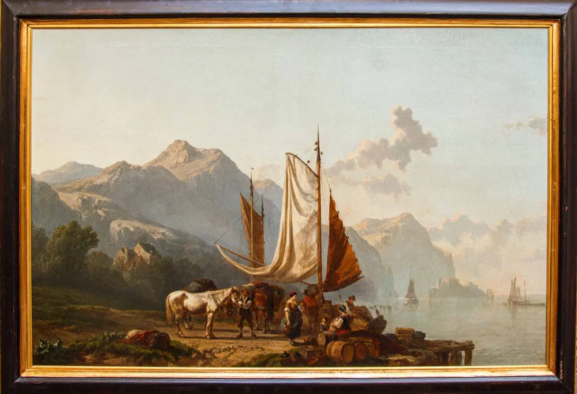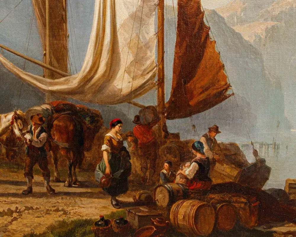 Questo dipinto ci trasporta in una scena pittoresca sulle sponde del Lago Maggiore, un luogo particolarmente caro all’artista. L’opera è pervasa da una luce dorata e soffusa, tipica del tramonto o dell’alba, che avvolge l’intero paesaggio conferendogli un’atmosfera serena e quasi idilliaca. Il cielo, nella parte superiore, sfuma da tonalità chiare e quasi giallastre a un azzurro tenue, con nuvole sparse che si stagliano morbide all’orizzonte. In primo piano, sulla sinistra, si sviluppa la riva del lago, caratterizzata da una vegetazione rada e rocciosa. Dominano la scena alcune figure umane e animali. Un cavallo o mulo bianco, robusto e imponente, è al centro dell’attenzione, suggerendo un’attività legata al trasporto di merci o persone. Attorno ad esso, un gruppo di personaggi vestiti con abiti tradizionali, probabilmente pescatori o commercianti locali, sono intenti nelle loro attività quotidiane. Alcuni sembrano scaricare o caricare del materiale, mentre altri sono seduti, forse in attesa o in riposo. Immediatamente dietro le figure, si erge una barca a vela con le vele ammainate, appoggiata sulla riva o forse ormeggiata a un piccolo molo, visibile sulla destra. Le sue vele, in tonalità chiare di bianco e marrone, catturano la luce del sole, creando un bel contrasto con le figure scure in primo piano. Sulla destra del dipinto, si estende la superficie calma e riflettente del Lago Maggiore. Sull’acqua si possono intravedere altre imbarcazioni in lontananza, le cui sagome si confondono con la foschia mattutina o serale, contribuendo a dare profondità alla scena. Lo sfondo è dominato da imponenti montagne che si ergono maestose, le cui forme sono ammorbidite dalla distanza e dalla luce. Le loro cime sfumano verso il cielo, creando un senso di vastità e tranquillità. La palette di colori utilizzata per le montagne varia dal grigio-blu al marrone chiaro, suggerendo la loro natura rocciosa e la loro imponenza.
