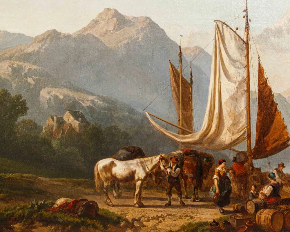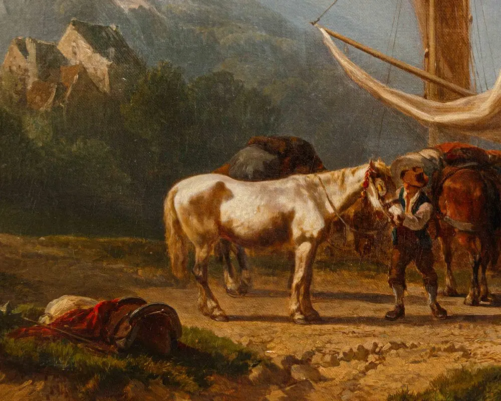 Alfred Edouard Agenor de Bylandt (1829-1890) fu una figura affascinante nel panorama artistico delle Fiandre ottocentesche, la cui vita e opera si distinsero per un’interessante fusione di nobiltà, servizio diplomatico e una genuina passione per la pittura. La sua biografia è intessuta di elementi che lo rendono più di un semplice artista, ma un testimone e interprete del suo tempo. Nato in una famiglia aristocratica, De Bylandt non fu un pittore a tempo pieno nel senso tradizionale del termine. La sua posizione di ciambellano del Re indica un ruolo di prestigio e responsabilità all’interno della corte belga, un incarico che senza dubbio lo poneva a contatto con ambienti influenti e gli permetteva una certa libertà finanziaria per coltivare le sue inclinazioni artistiche senza le pressanti esigenze commerciali che spesso affliggevano altri pittori. Questa doppia vita, tra le sale dei palazzi reali e gli atelier, tra gli affari di stato e le tele, è un aspetto distintivo della sua personalità. Il suo spirito inquieto e la sua sete di conoscenza si manifestarono attraverso un’intensa attività di viaggiatore. De Bylandt non si limitò a dipingere il Belgio o i Paesi Bassi; le sue tele sono una testimonianza dei suoi numerosi soggiorni all’estero. In particolare, i paesaggi svizzeri e italiani che adornano la sua produzione rivelano un’attenzione particolare per la natura, per le montagne maestose e le atmosfere luminose del Mediterraneo. L’Italia, con la sua ricchezza di storia, arte e paesaggi mozzafiato, fu una meta prediletta per molti artisti del XIX secolo, e De Bylandt non fece eccezione. Le sue opere raffiguranti scene italiane, come Il mercato di Cannollio o Il tramonto sul lago Maggiore, non sono solo vedute topografiche, ma esprimono un sentire, un’interpretazione personale della luce e del colore di quei luoghi. La sua attività artistica si svolse prevalentemente tra Bruxelles e l’Olanda, con una particolare predilezione per la regione di Arnhem, dove probabilmente trovò ispirazione per numerosi paesaggi rurali e scene di vita quotidiana. Questo pendolarismo tra diverse realtà geografiche e culturali arricchì indubbiamente la sua visione artistica, permettendogli di spaziare tra soggetti e atmosfere diverse.