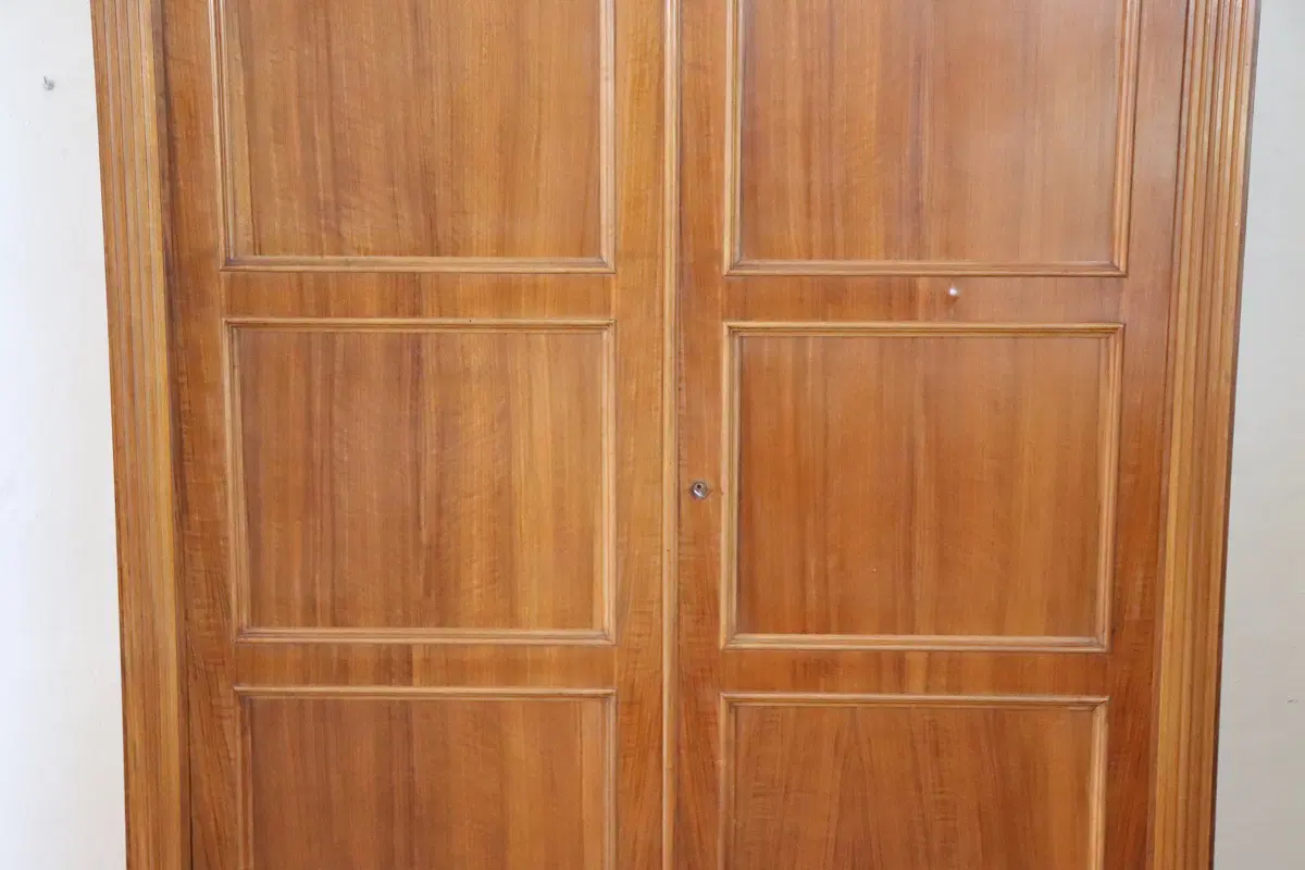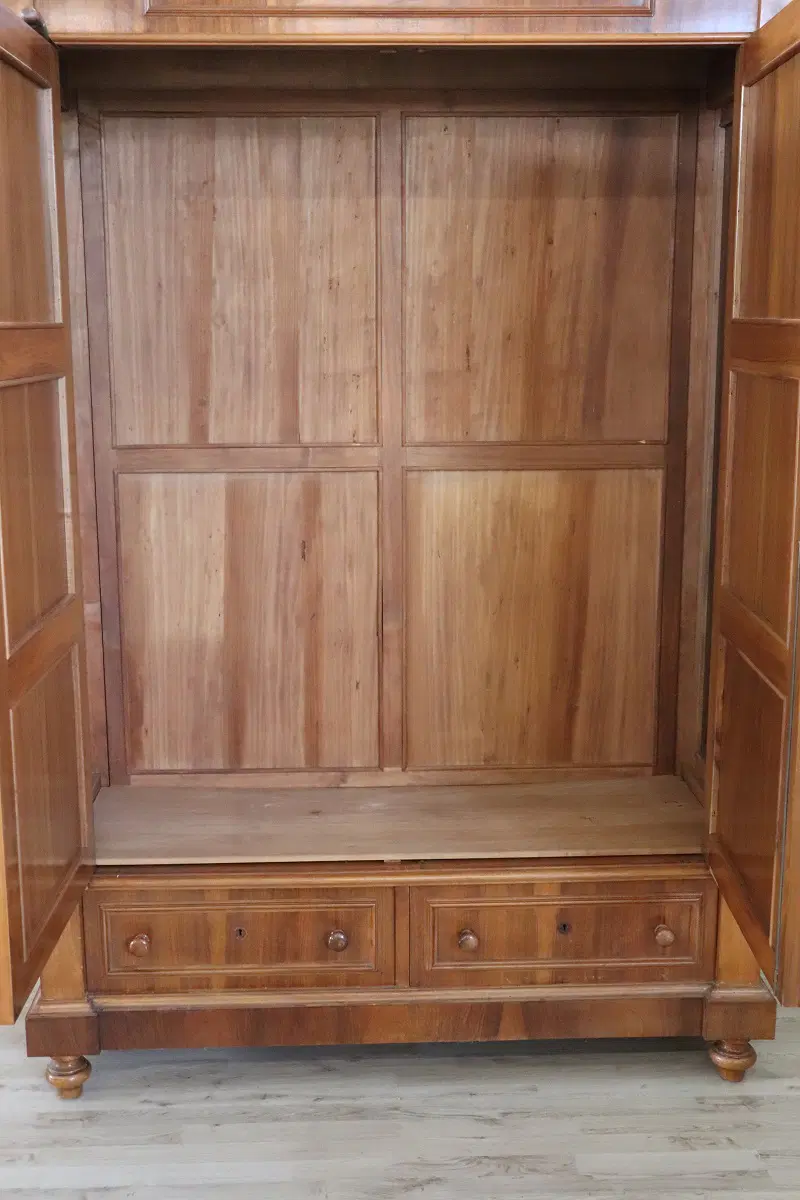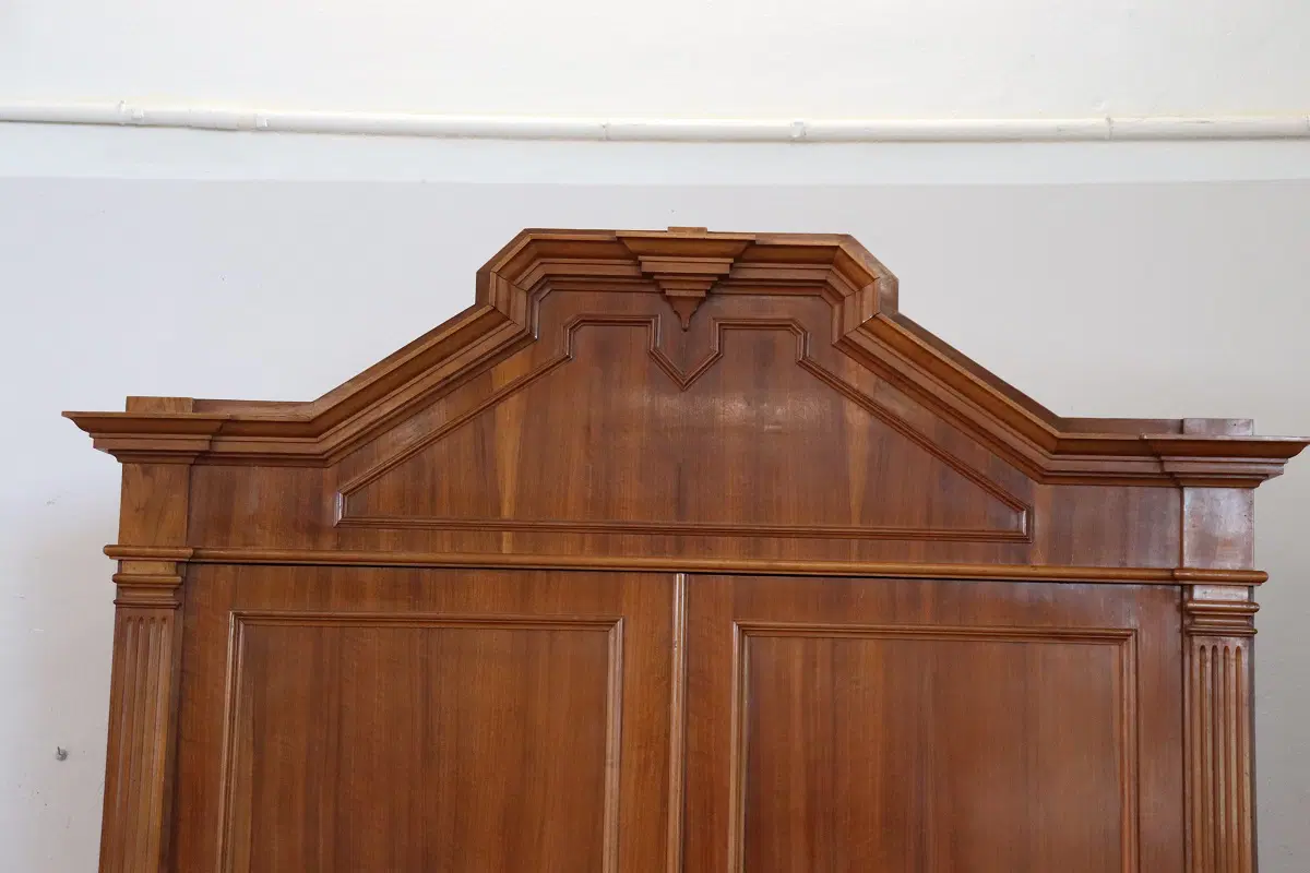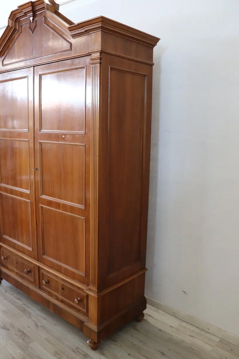 Antico armadio italiano in legno massello impiallacciato noce realizzato alla fine del XIX secolo. Particolarissimo armadio caratterizzato da un cappello slanciato con una cornice dalla linea geometrica. Dotato di due ante, l’interno è attrezzato con un’asta per appendere gli abiti, nella parte inferiore due comodi cassetti. Possibilità di cambiare l’interno in base alle proprie esigenze. Armadio molto semplice e lineare in colore noce chiaro, perfetto anche per un ambiente moderno. Attenzione l’armadio viene spedito smontato. Il montaggio non è incluso nella consegna. Proposto ad un’ottimo prezzo trattabile vi invitiamo ad inviarci le vostre proposte di acquisto le valuteremo con piacere. Vi consigliamo comunque di guardare bene in dettaglio tutte le foto allegate.