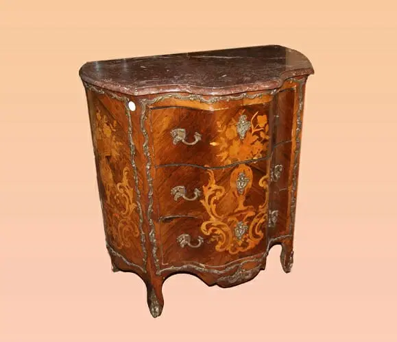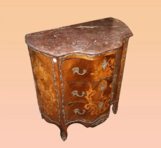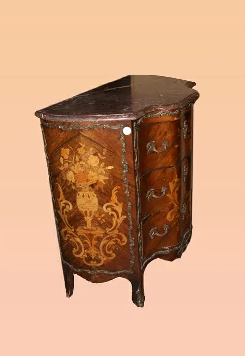 Comò 3 cassetti francese della seconda metà del 1800, stile Luigi XV, in legno di palissandro. Presenta ricche applicazioni in bronzo piano in marmo e intarsi floreali su tutta la sua superficie.