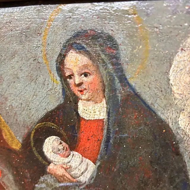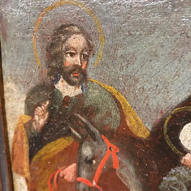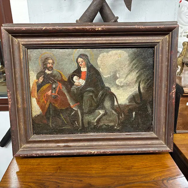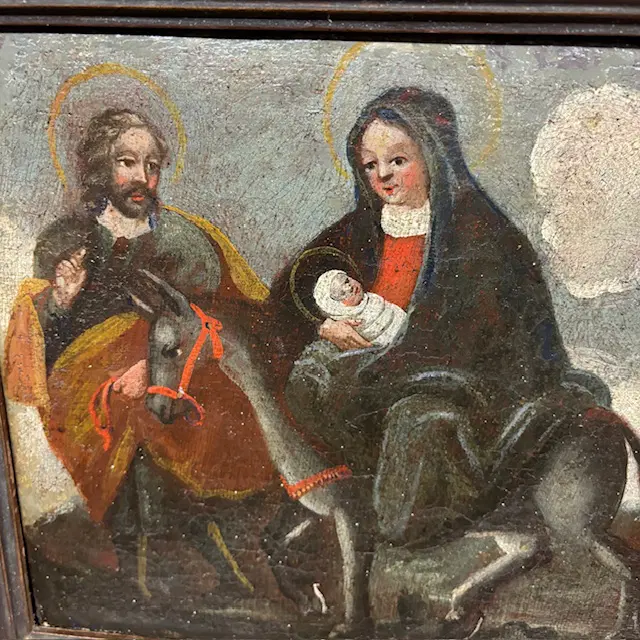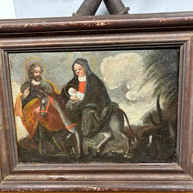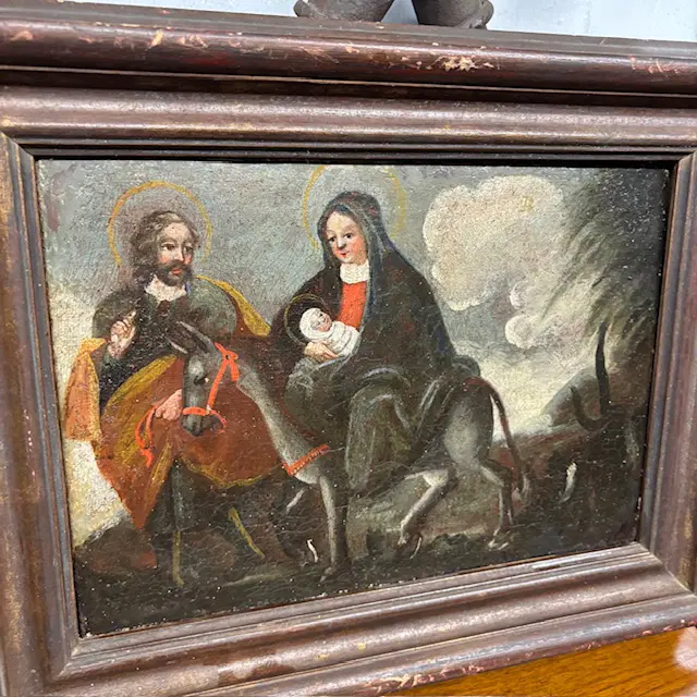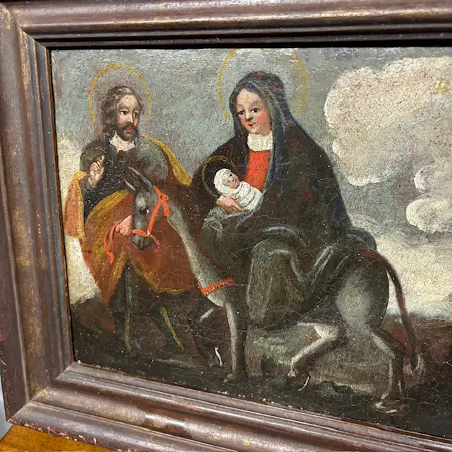 Antico dipinto olio su tela raffigurante  Fuga d’ Egitto XVII sec, scuola italiana.  Solo tela Mis 36 x 26. Con cornice di epoca successiva 50 x 40 . Buono stato di conservazione . Non sono necessari interventi .