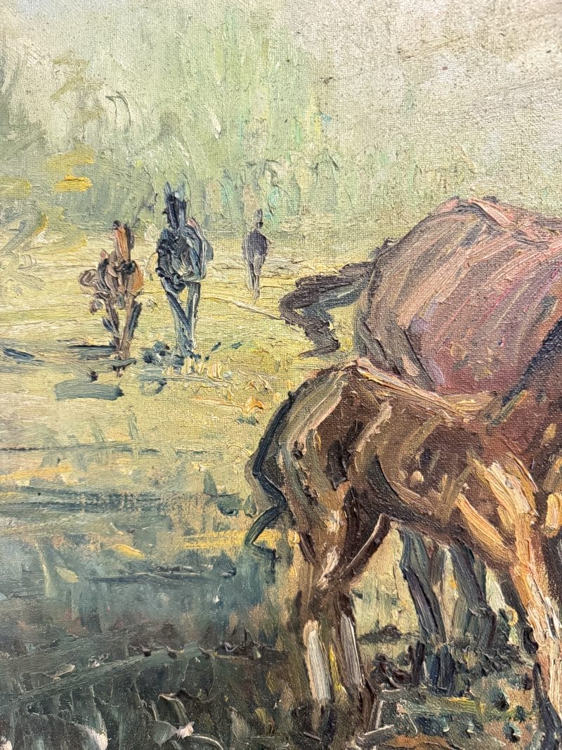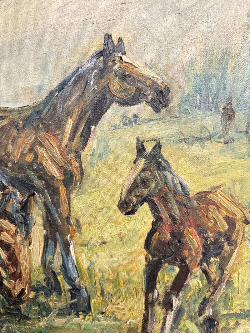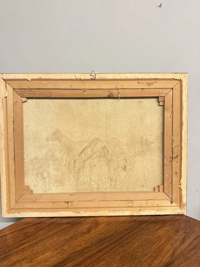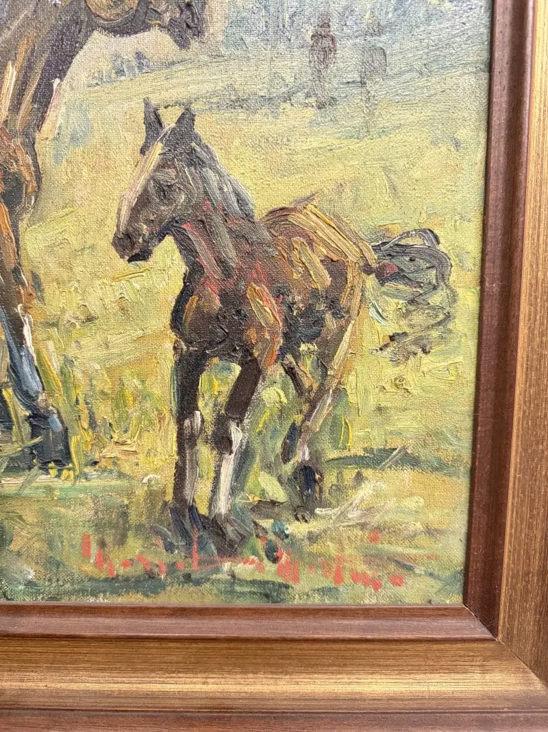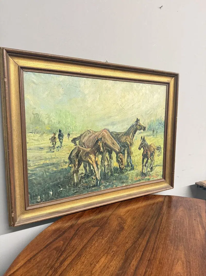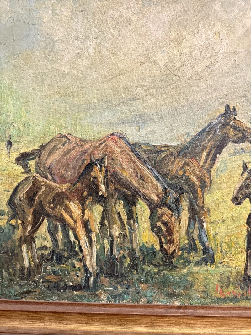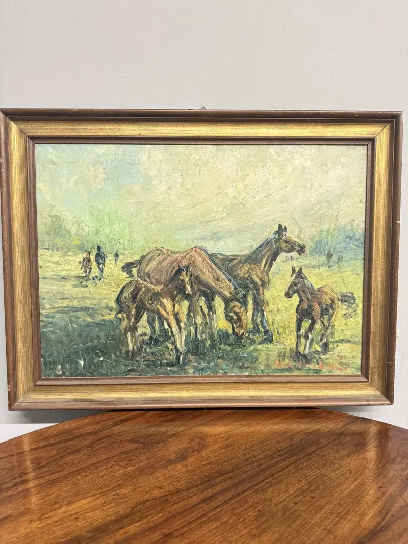 Antico dipinto olio su tela – Cavalli al pascolo – 1900, 82x62cm, firmato in basso a destra. Cornice dorata di epoca successiva. Solo dipinto 68×49. Buono stato di conservazione.