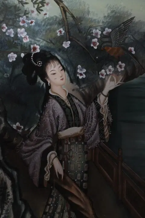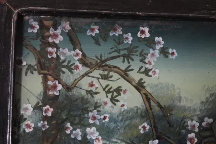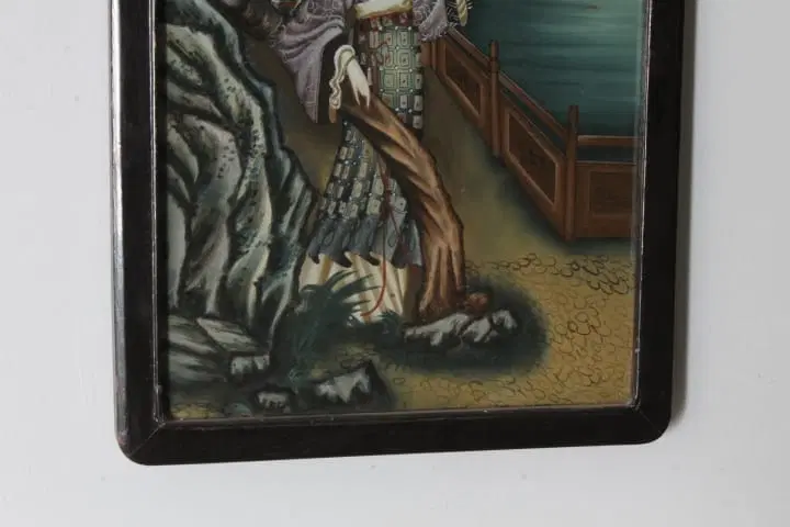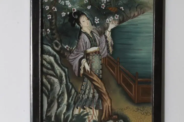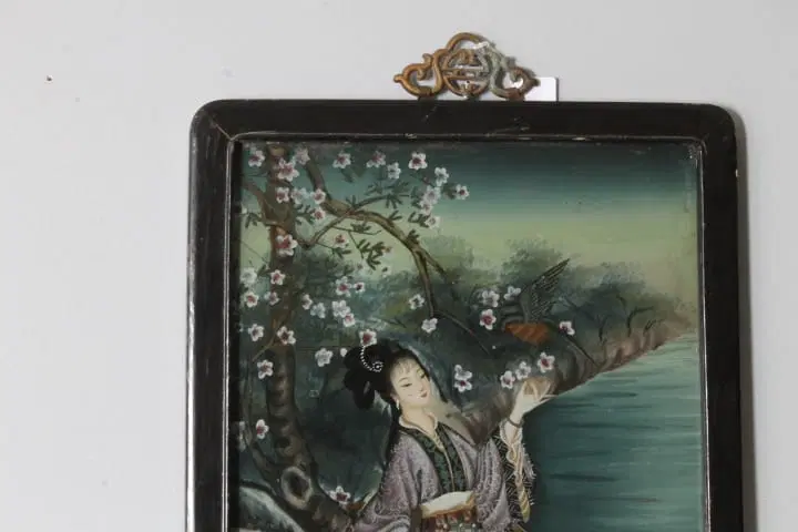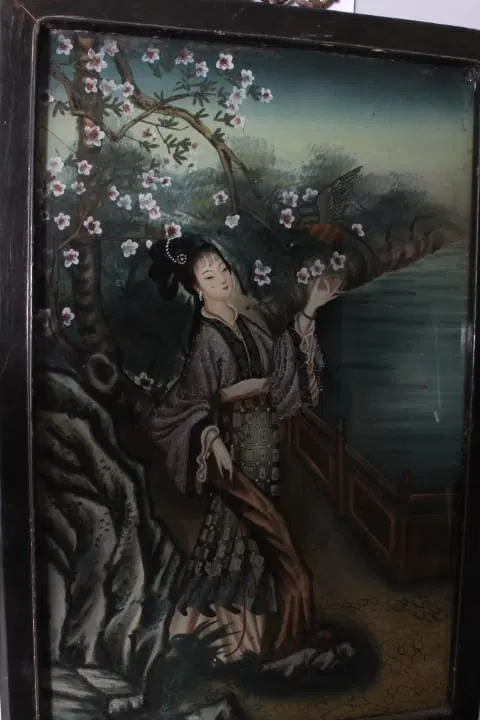 Antico bellissimo dipinto su vetro raffigurante Geisha Giapponese risalente ai primi anni del 900 . Bellissima la qualità pittorica. In cornice di legno laccata nera coeva . Mis 52 x 35