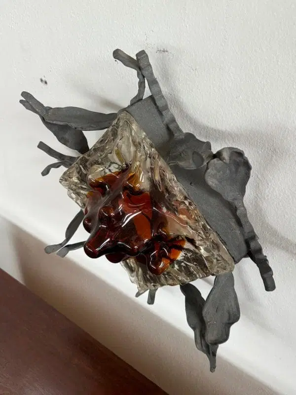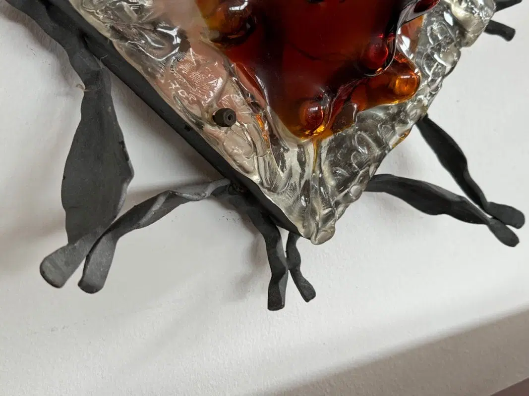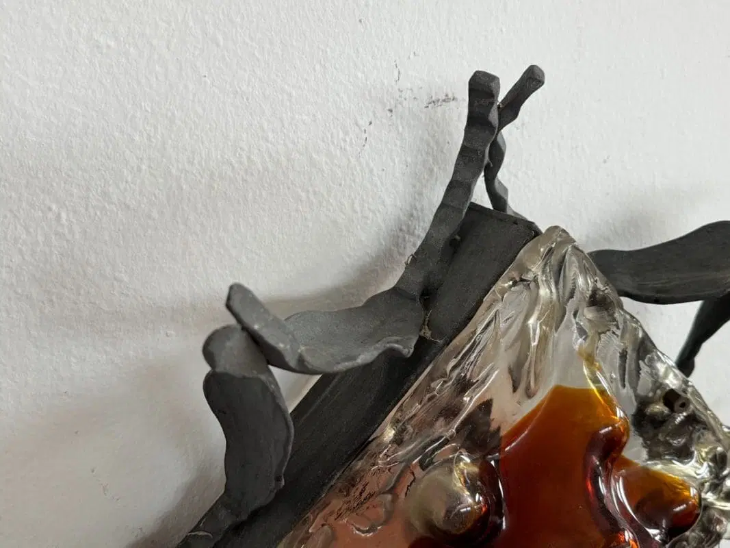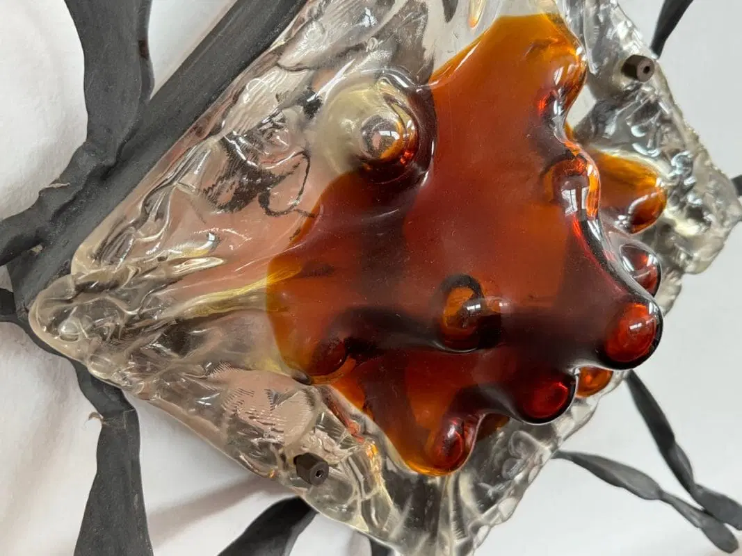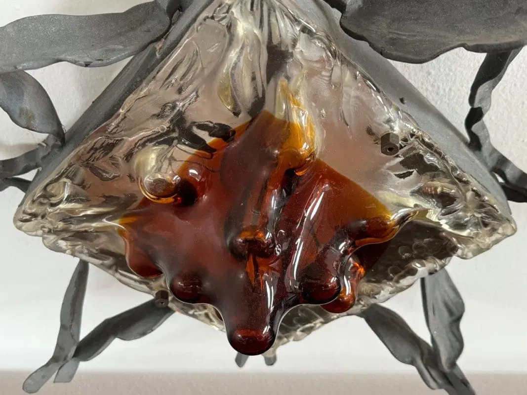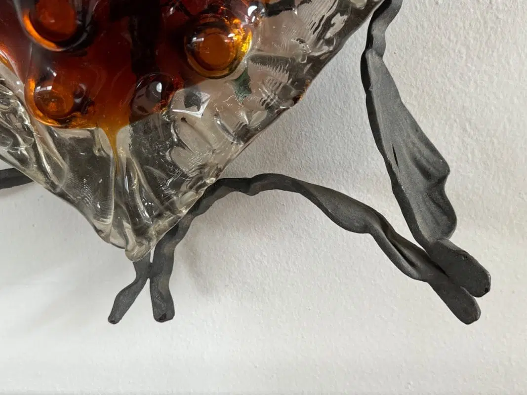 Base lavorata in Ferro e Paralume In Vetro bicolore ambrato nello Stile di Mazzega.