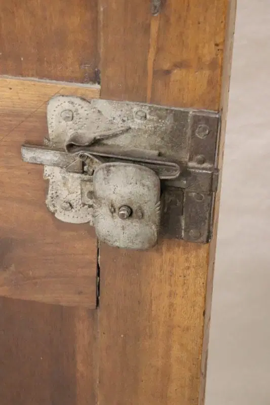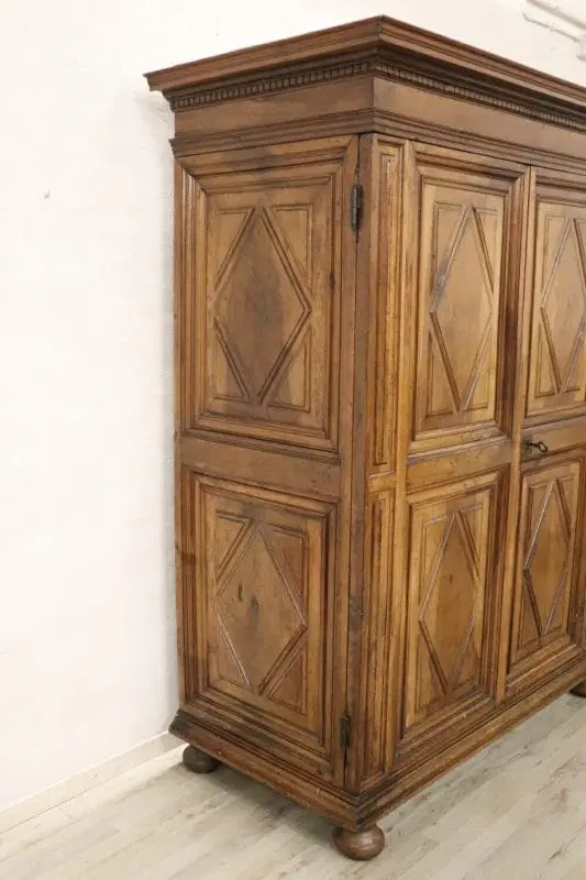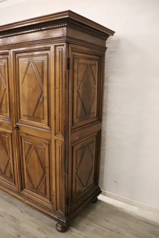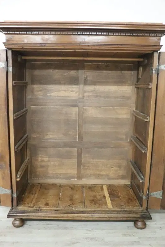 armadio antico italiano in noce massello realizzato alla fine del XVII secolo del periodo Luigi XIV. La linea è infatti tipica di questo periodo di alta epoca che voleva questo tipo di arredi di grande imponenza realizzati in legno massello di noce. Nelle ante e nei fianchi pannelli decorativi a motivo geometrico. Internamente è dotato di un’asta per appendere i vestiti, in origine c’erano dei ripiani che sono andati perduti. È possibile aggiungere dei ripiani se il cliente lo desidera. Presenta la chioderia e la ferramenta del XVII secolo. Il cilindro ha un vano segreto, la parte superiore si alza e può contenere gli oggetti riservati. Armadio di rara importanza.