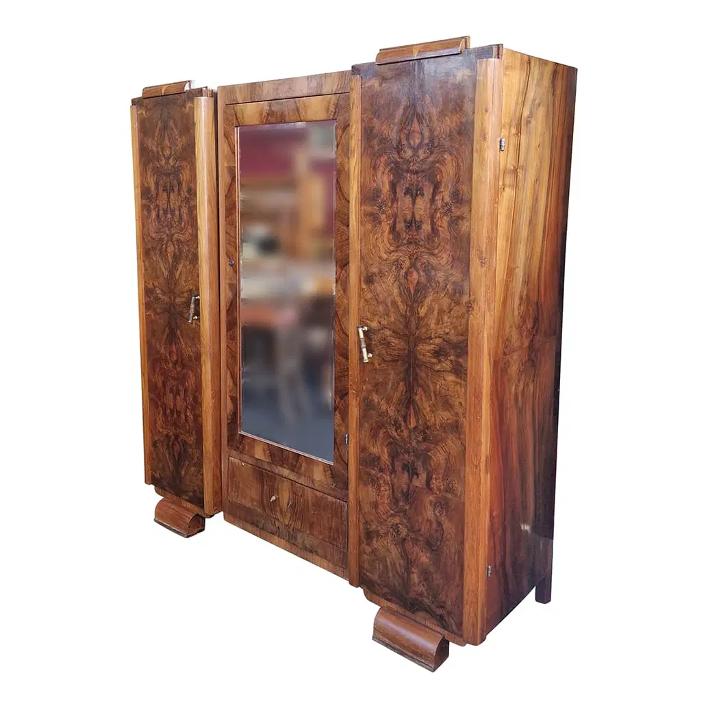 Armadio Art Déco radica di noce dotato di due vani laterali con ante cieche, un vano centrale con un’anta a specchio e un cassetto nella parte inferiore.