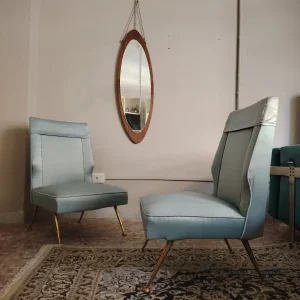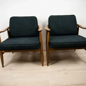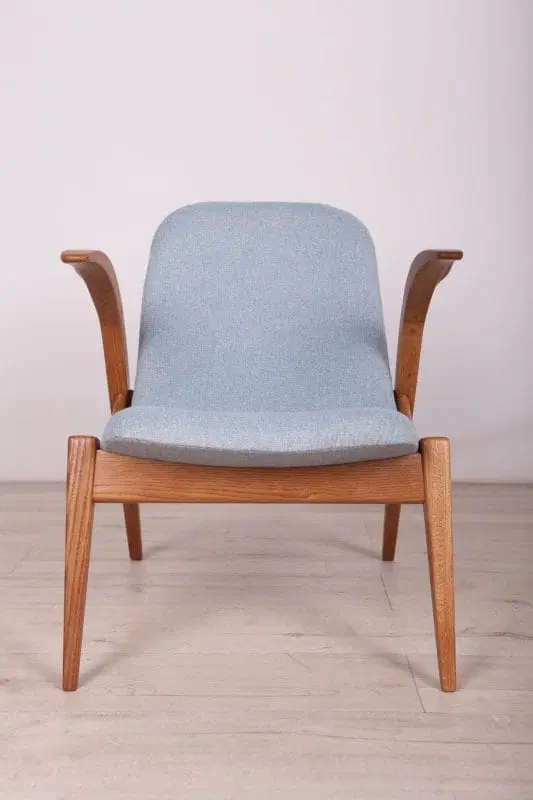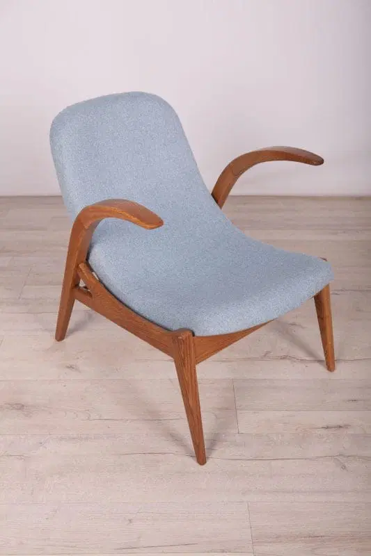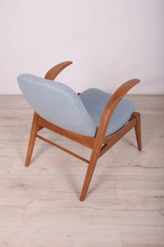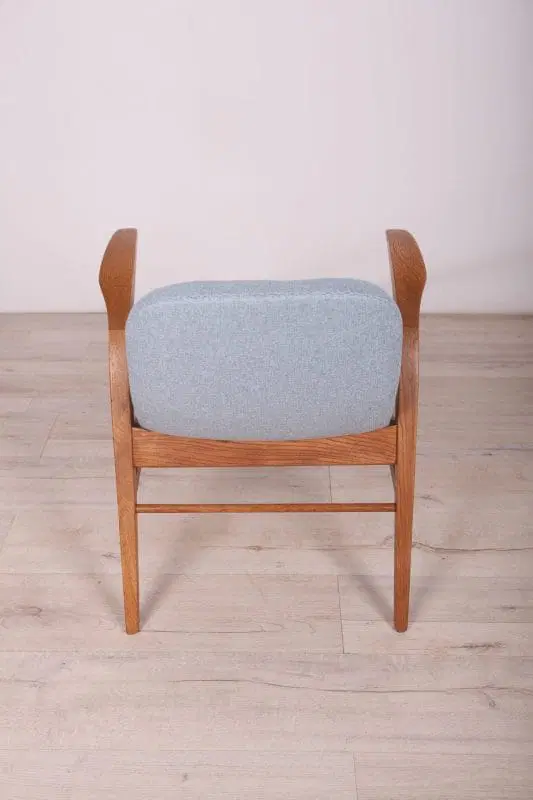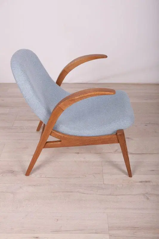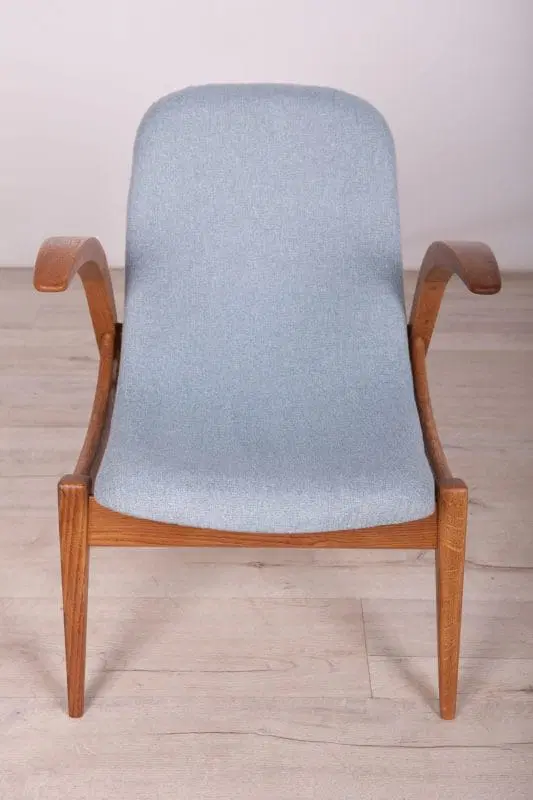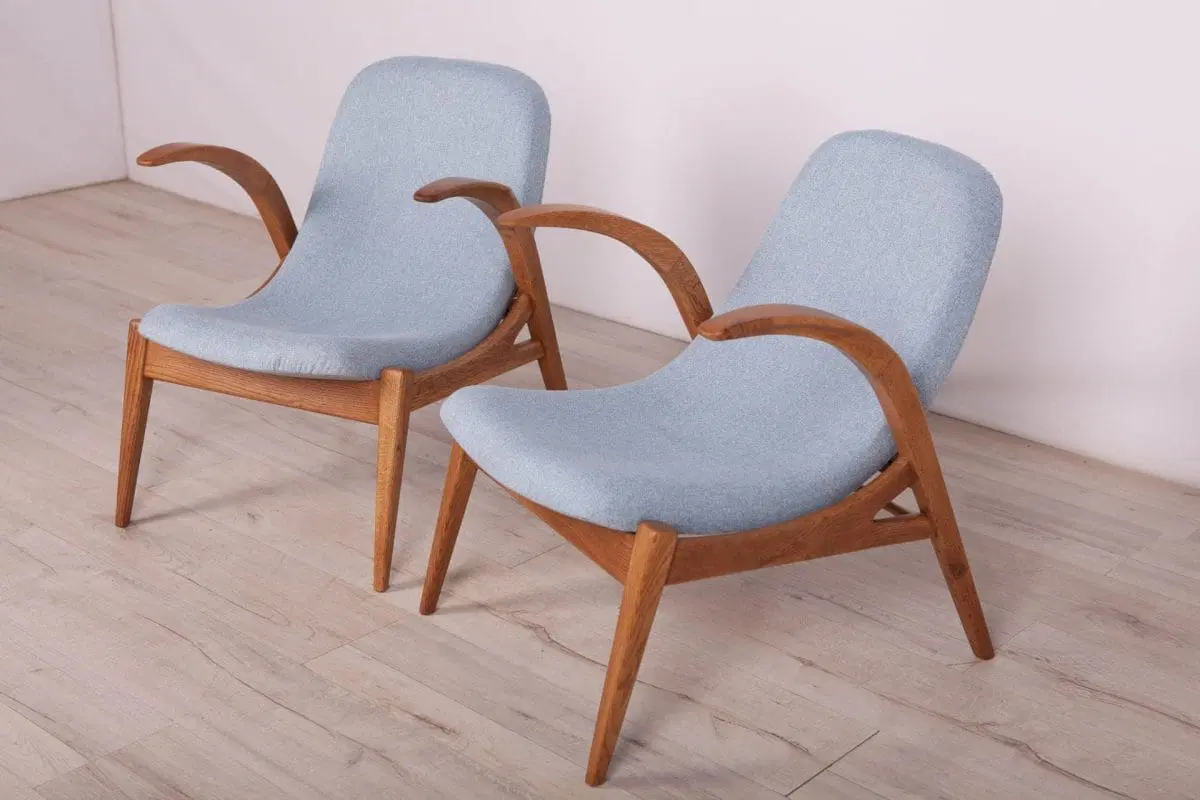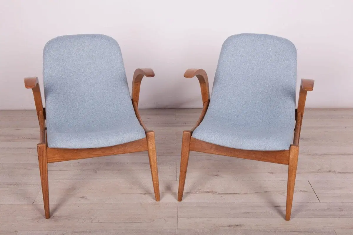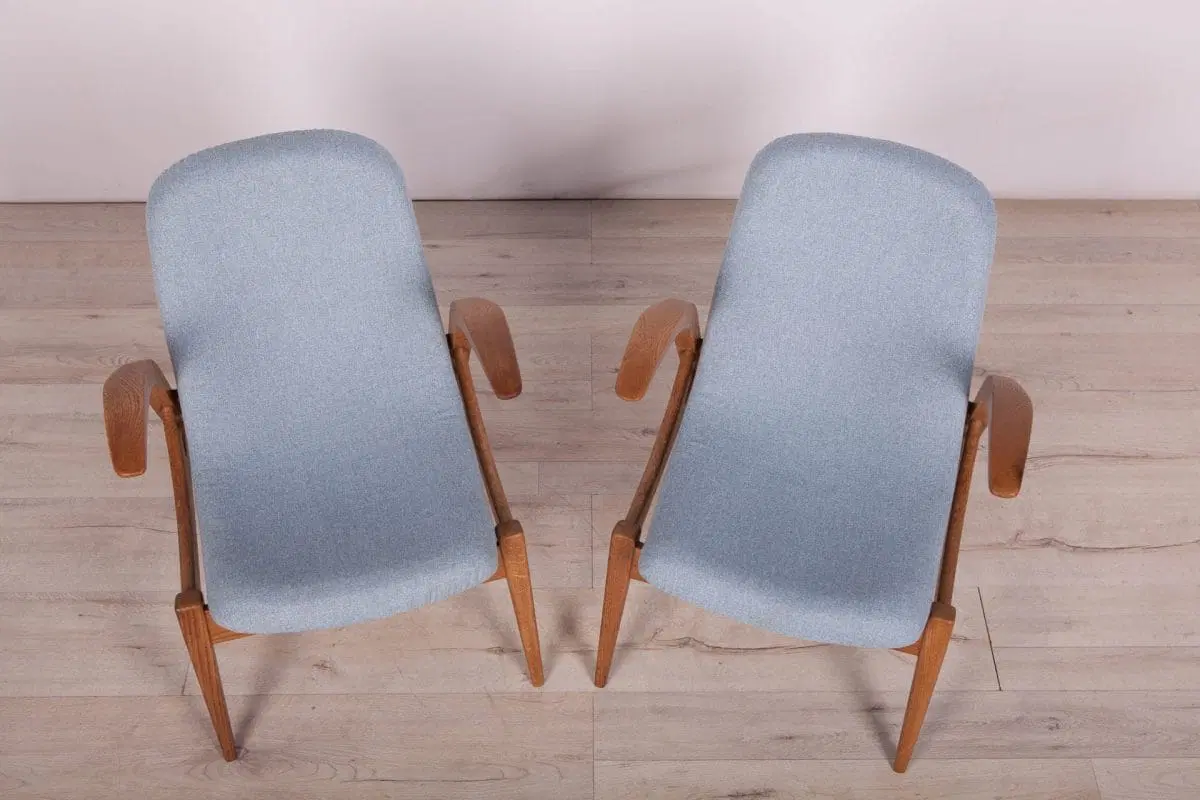 This pair of small armchairs was produced by the Czechoslovak company ULUV in Praha the 1960s. The oak wood elements have been cleaned and finished with oak-colored wax. The interior upholstery has been changed and covered with a sky blue fabric.