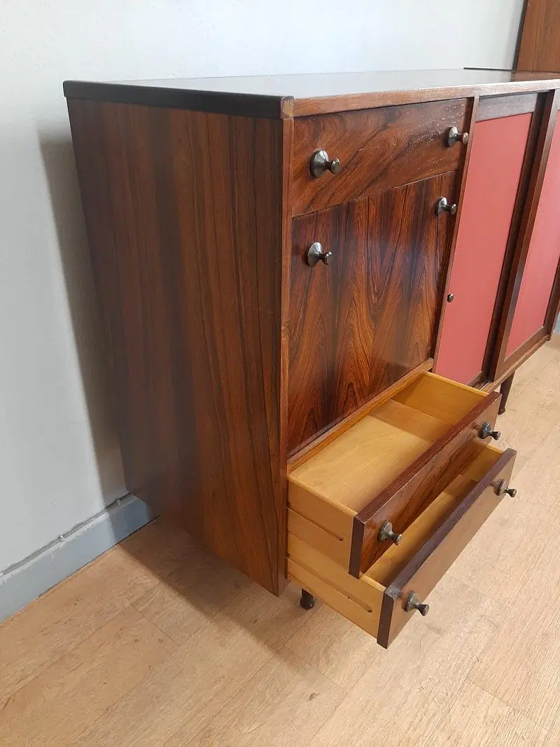 note: Credenza highboard design nordico degli anni ’60 , completamente rivestita in palissandro del brasile con gli sportelli del fronte in rivestimento fenolico rosso originale dell’ epoca. Appena ripulita e risanata è pronta per essere posizionata e utilizzata da subito.