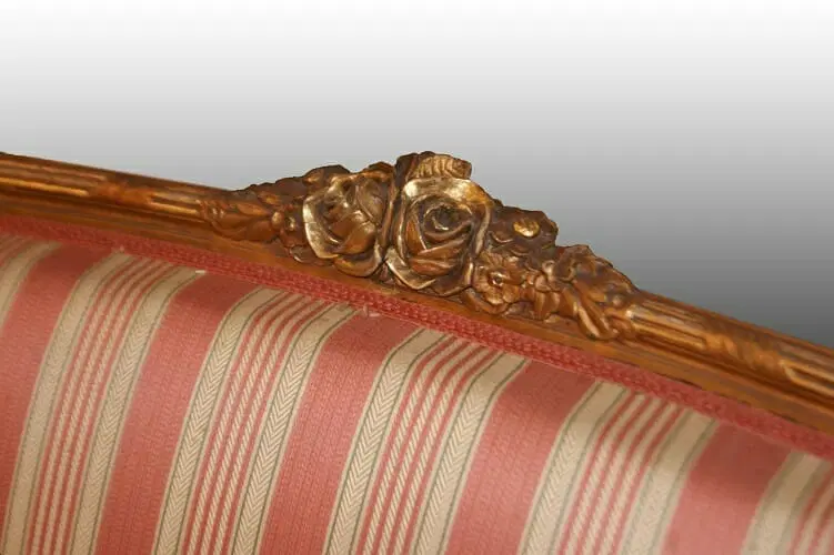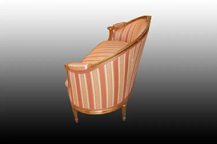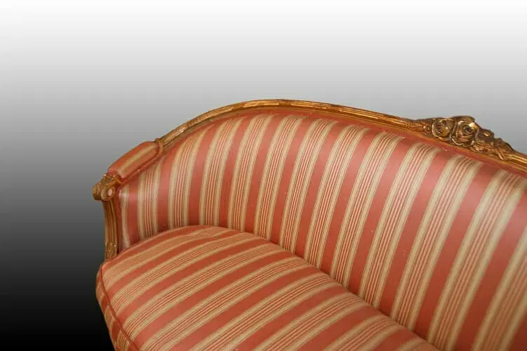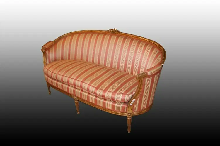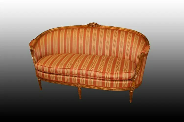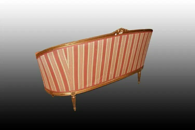 Bellissimo divano francese di metà 1800, stile Luigi XVI, in legno dorato foglia oro. Presenta fregi sulla testata, gambe a spillo e tessuto a fasce in perfetto stato.