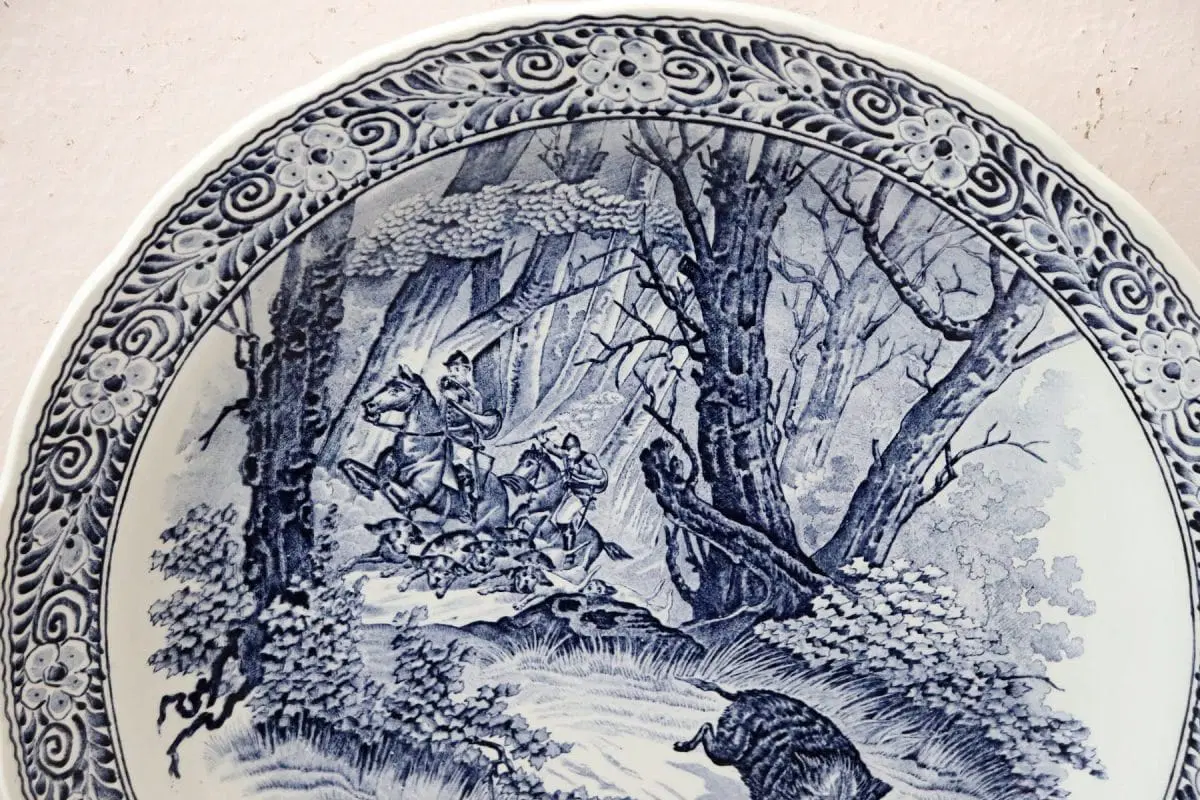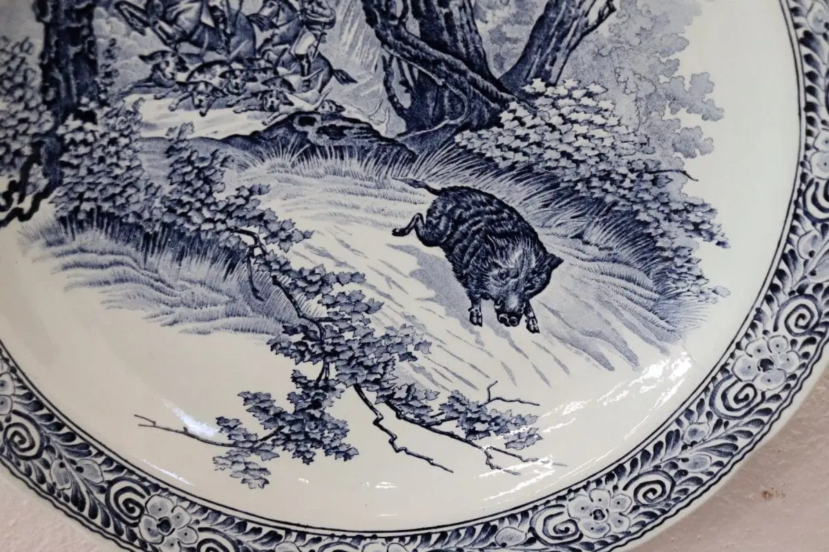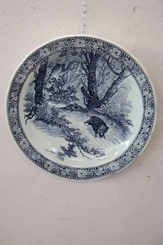 Bellissimo piatto in ceramica artistica 1950 circa importante marchio della ceramica di Delft alla base. Caratterizzato dalla tipica decorazione nei toni del blu cobalto animata scena di caccia al cinghiale. Articolo da collezione. Perfette condizioni, vi consigliamo comunque di guardare bene in dettaglio tutte le foto allegate.