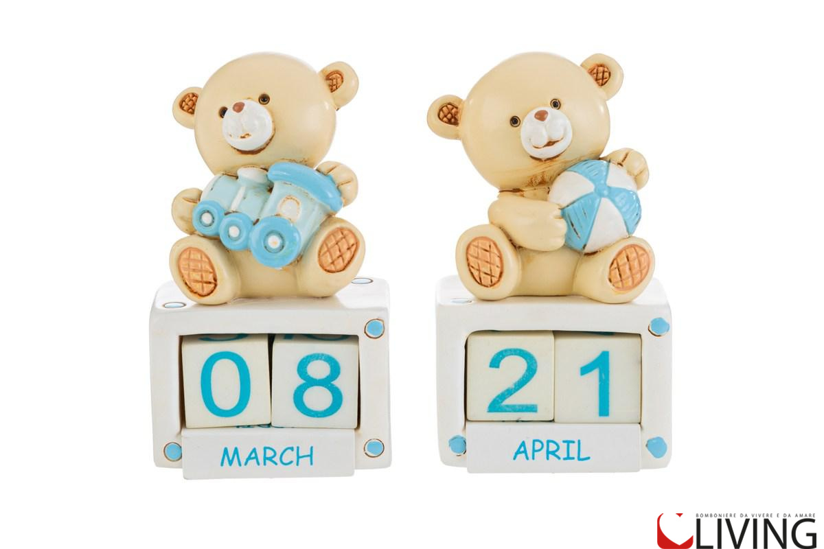 Design: Rappresenta un dolce orsetto celeste in due varianti, che tiene in mano un giocattolo (trenino o pallina).