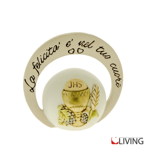 Il portacandele è decorato con un’illustrazione dolce e raffinata: un bambino vestito per la Prima Comunione, accanto a un albero dai rami intrecciati con cuori dorati. A completare il design, la frase ispiratrice “Se puoi sognarlo, puoi farlo”, un messaggio di fiducia e speranza per il futuro del festeggiato. Inoltre, il libro aperto con il rosario richiama l’importanza della fede in questo evento significativo.