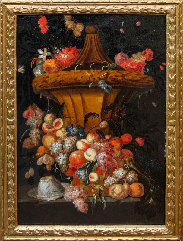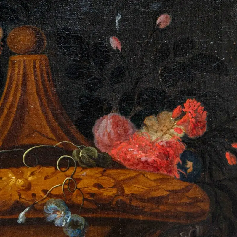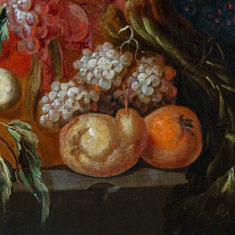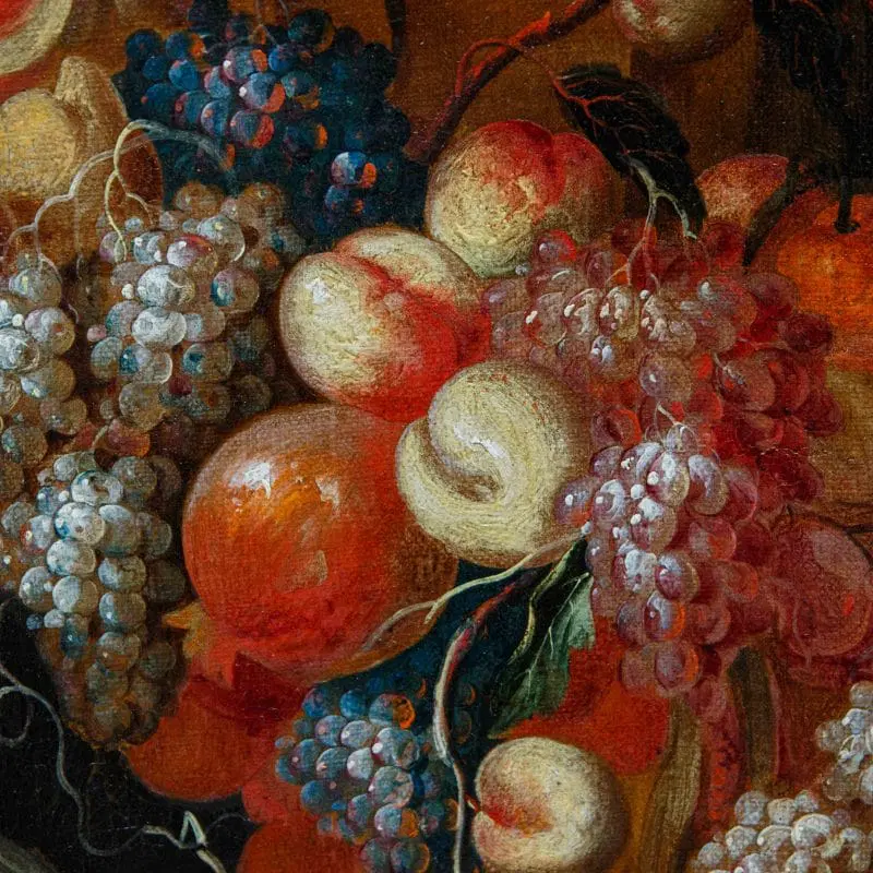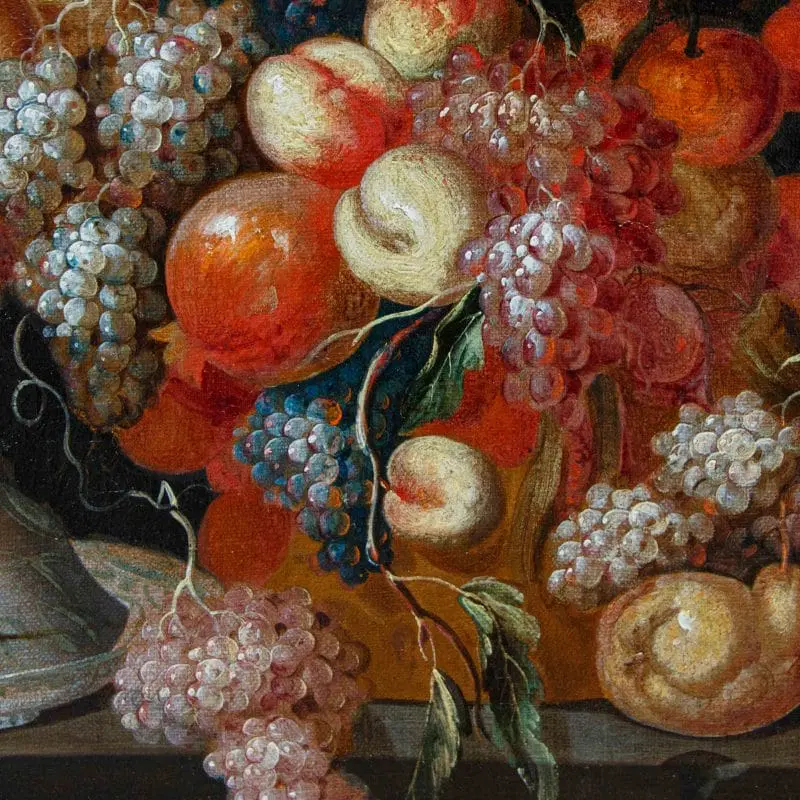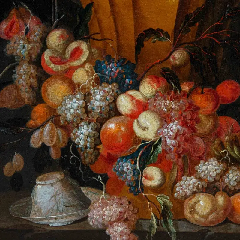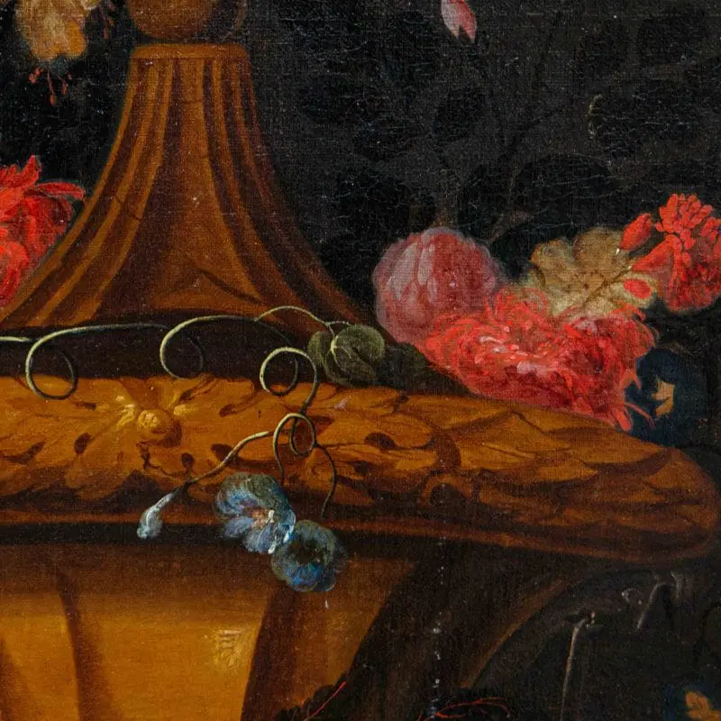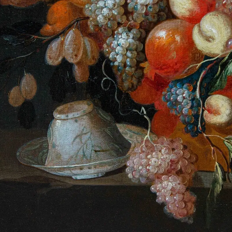La tela in esame, riferibile per caratteristiche stilistiche e formali alla bottega di Jan Pauwel Gillemans Il Vecchio, presenta, infatti, gli stessi attributi che contraddistinguevano le opere del maestro, come ad esempio travolgenti composizioni a cascata, spesso sovraccariche di elementi in precario equilibrio; un livello di dettaglio estremamente elevato e realistico, dove ogni texture, ogni foglia, ogni goccia d’acqua, ogni venatura è resa con precisione quasi fotografica; un modellato dolce, armonico, in cui predomina il contrasto tra lo sfondo, generalmente scuro, ed una tavolozza variegata, squillante, calibrata su cromie quasi al limite della saturazione. Nel caso qui esposto l’artista si cimenta in una composizione ricca e complessa, che si sviluppa verticalmente: al centro dell’opera è presente un grande vaso metallico ornato, traboccante di una profusione di fiori e frutta. I fiori, dai colori vivaci e di diverse tipologie, creano un’affascinante contrapposizione con la frutta matura, che giace su un piano inferiore. Una delicata tazza in porcellana bianca dipinta riversa sul suo piattino completa l’opera, aggiungendo un tocco di eleganza.