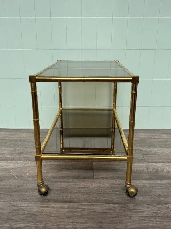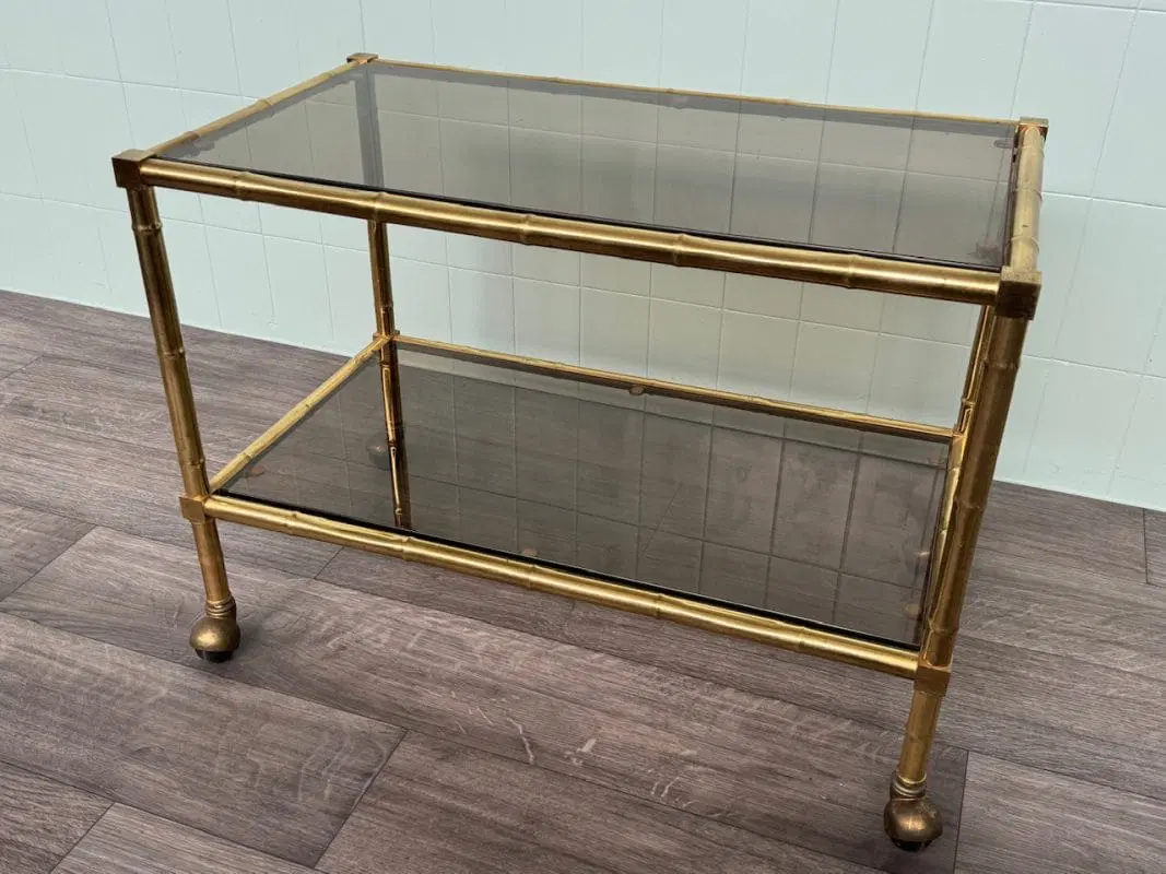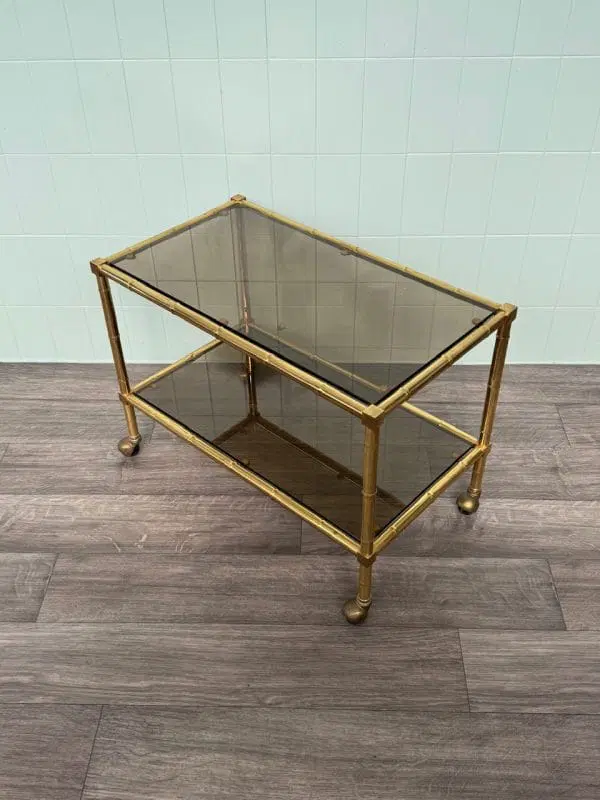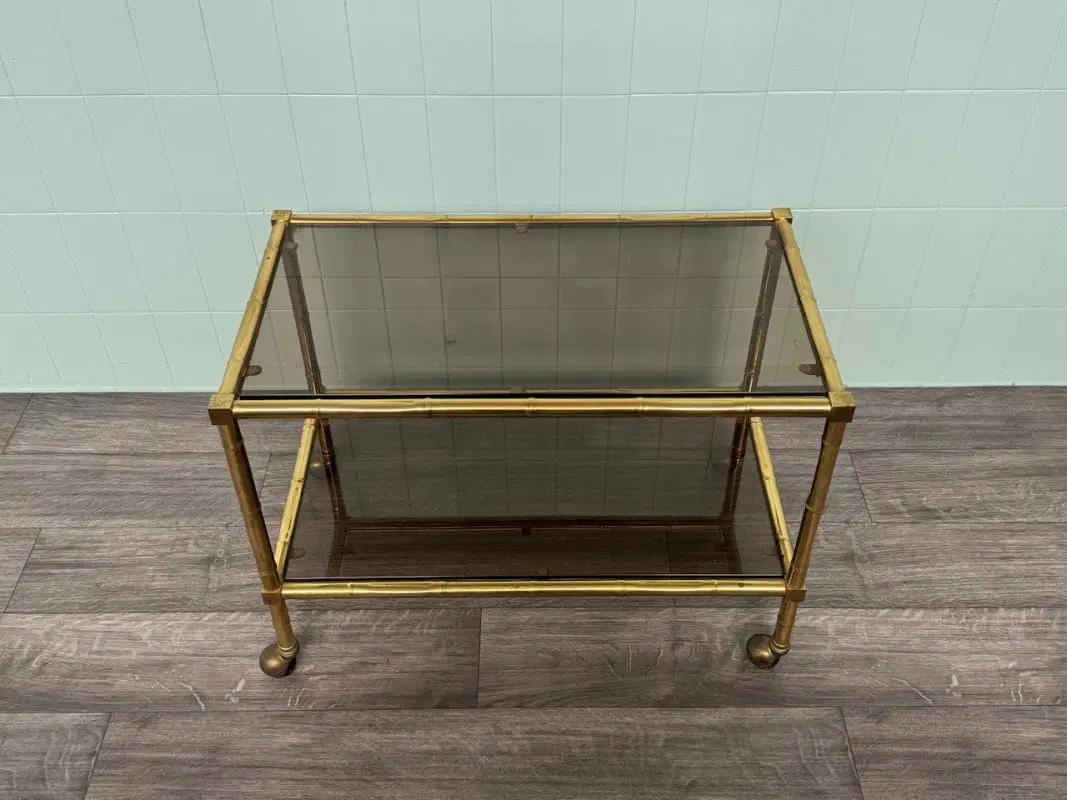 Carrellino con struttura in ottone finto bambù e piani in vetro fumè.