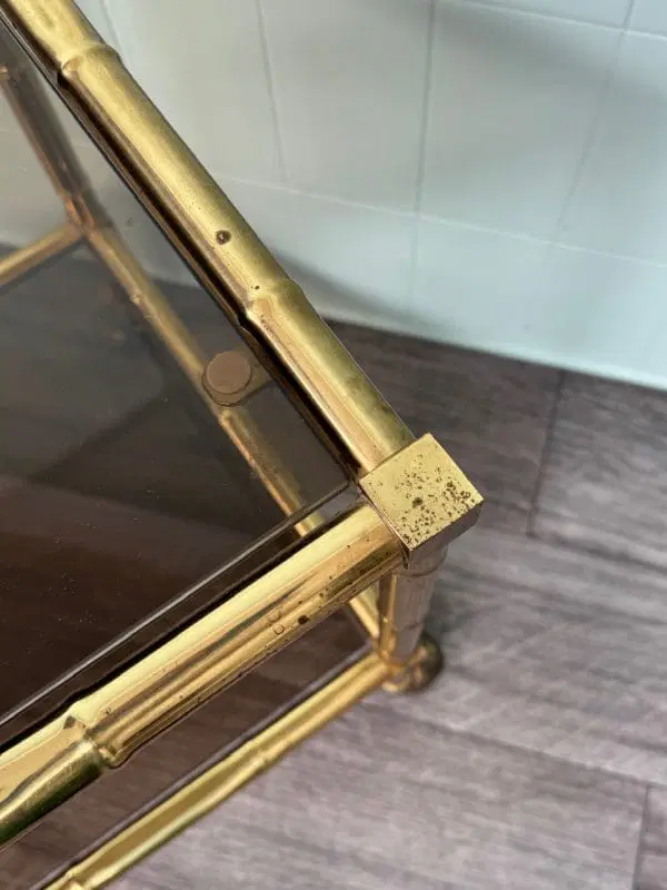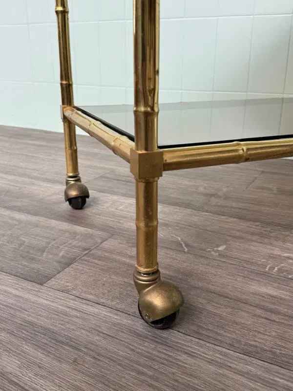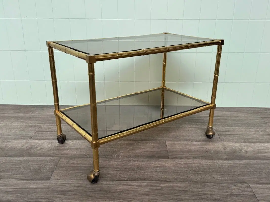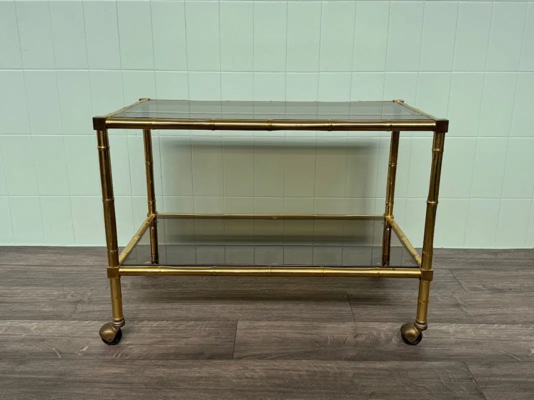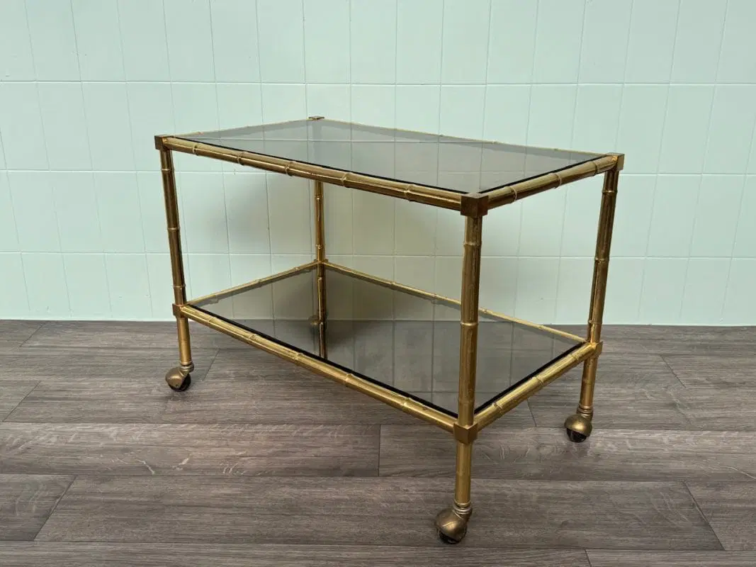 Carrellino con struttura in ottone finto bambù e piani in vetro fumè.