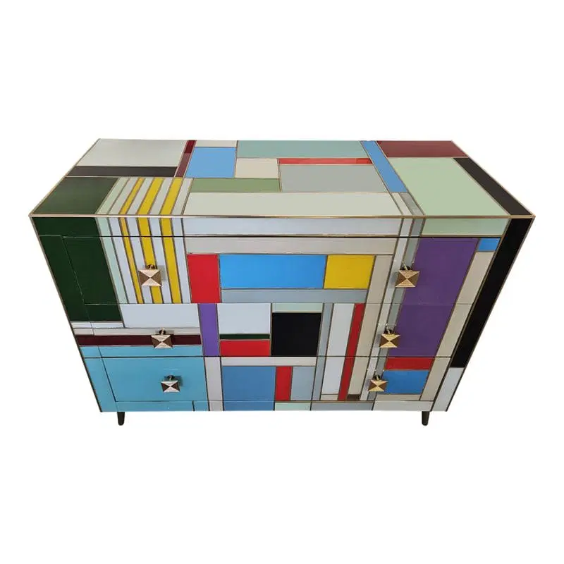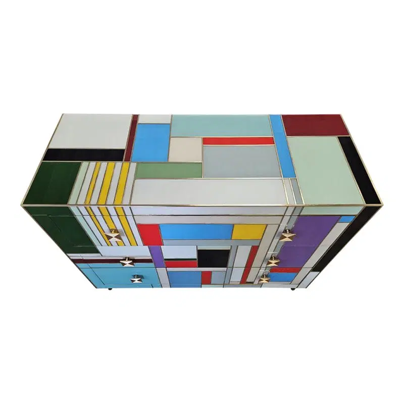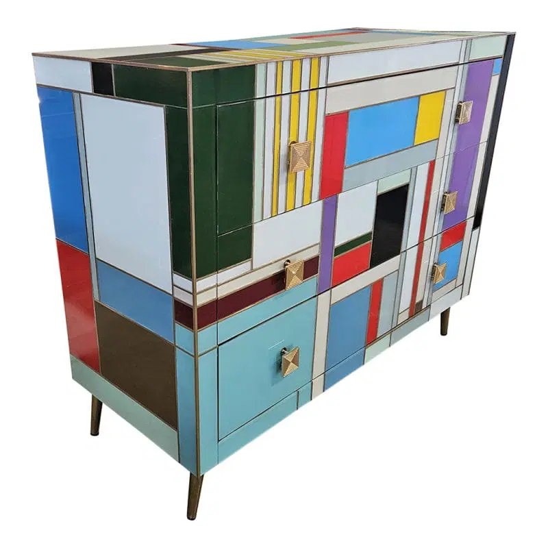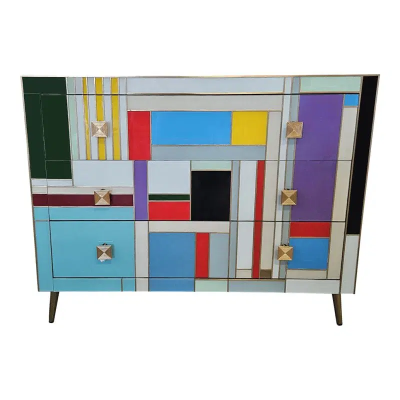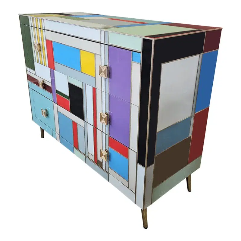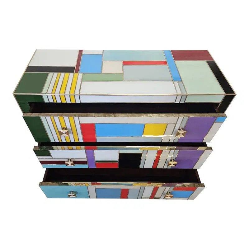 Comò cassettiera con tre cassetti, completamente realizzata a mano, struttura in legno rivestita con vetri colorati, profili, maniglie e piedi in ottone dorato.