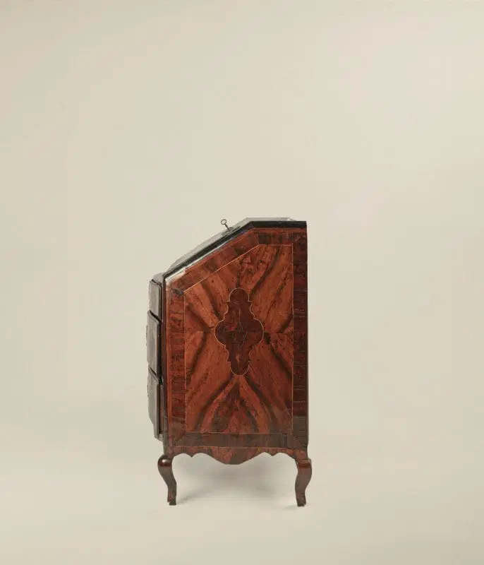 Cassettone a ribalta lastronato in noce e radica di noce, Piemonte, XVIII secolo.