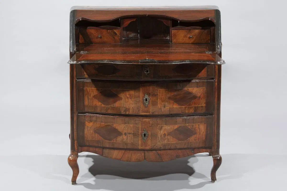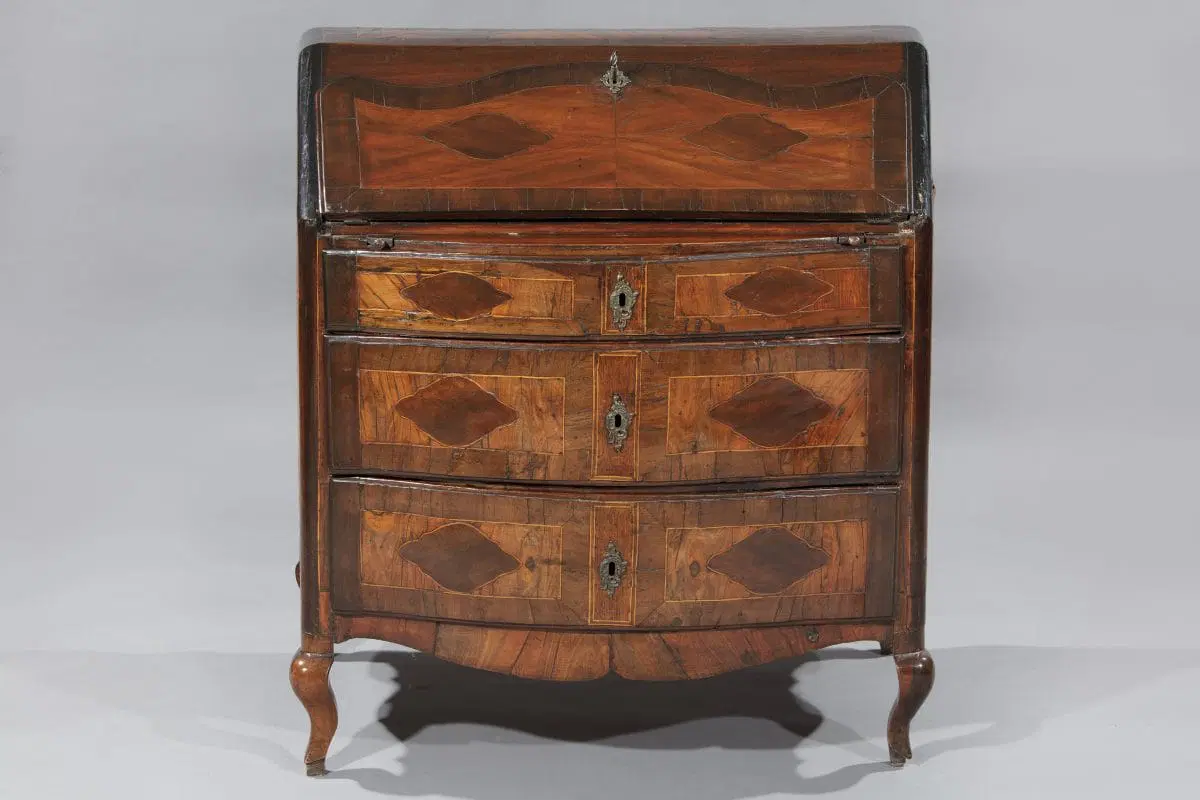 Fronte bombato a tre cassetti decorati da riserve mistilinee entro pannelli. Nella calatoia due cassetti e tre vani. Grembiale sagomato e fianchi dritti intarsiati con decoro simile al fronte. Gambe mosse, cm 105x100x64. Difetti e restauri.