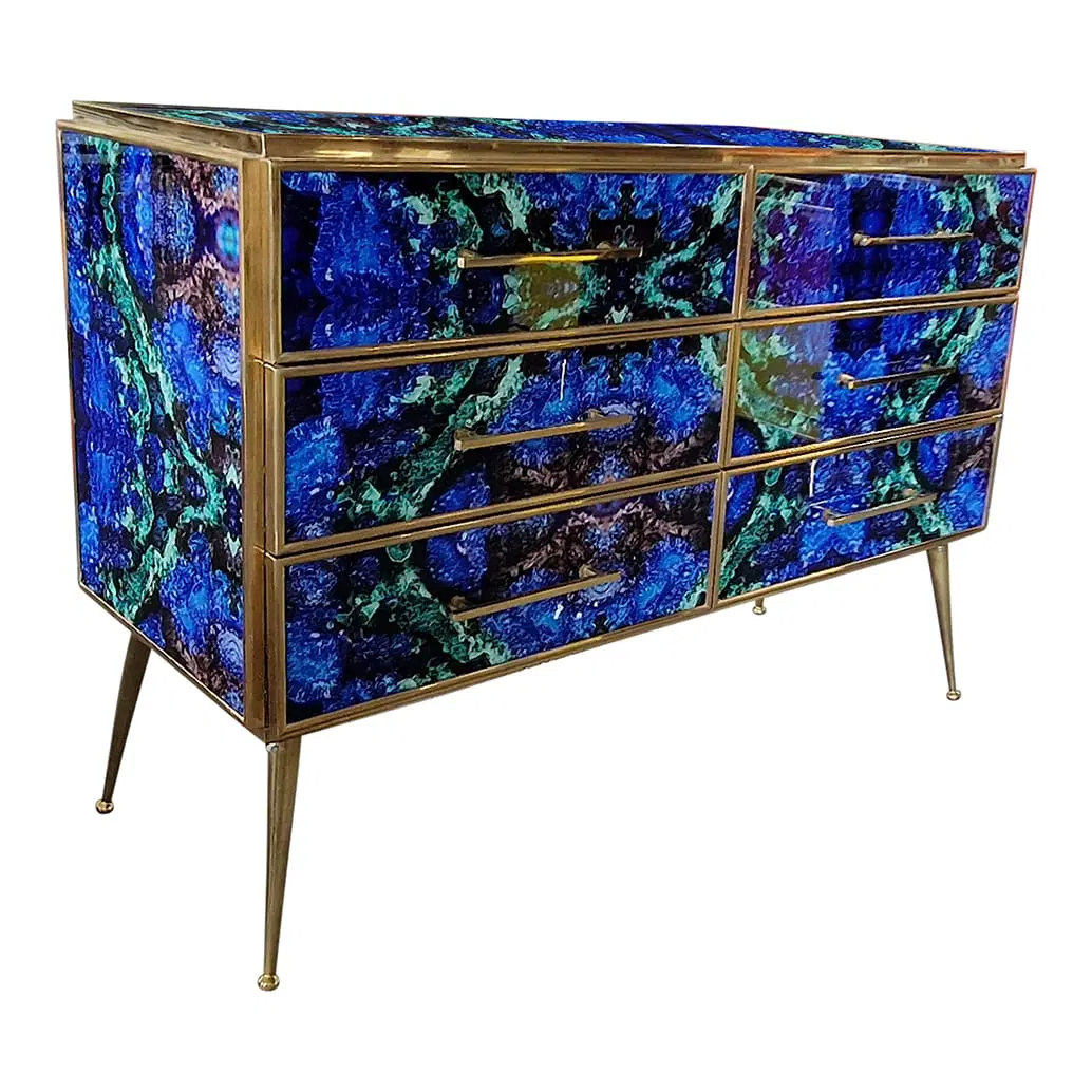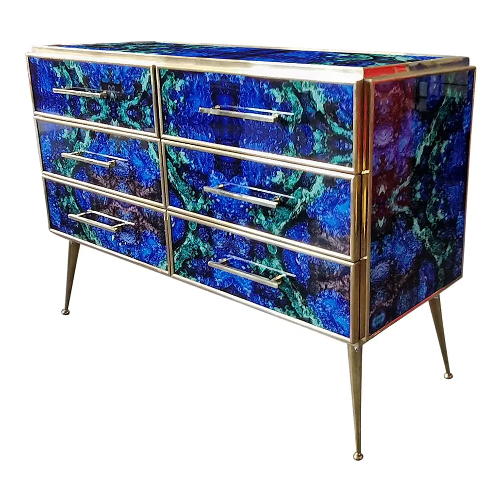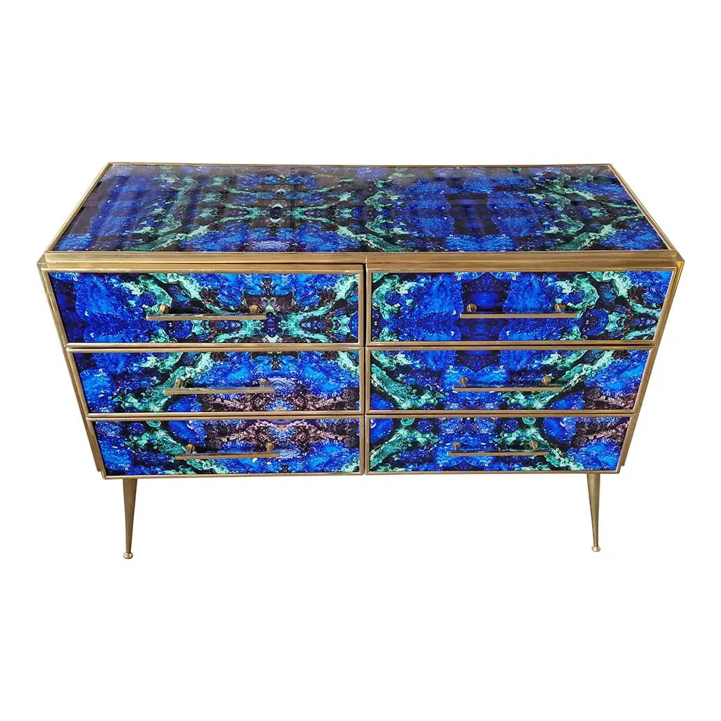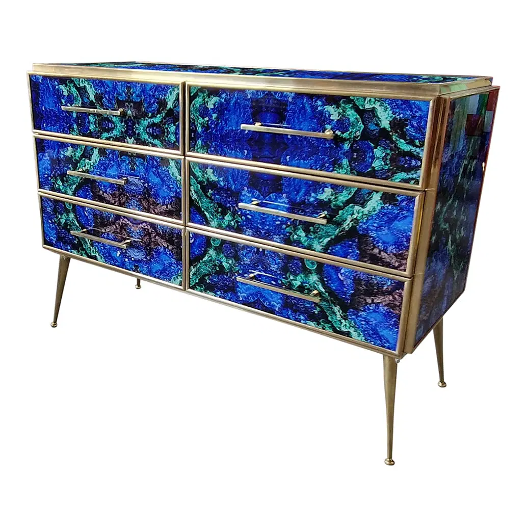 Comò in legno rivestito in vetro color lapislazzuli con sei cassetti , profili maniglie piedini in ottone.