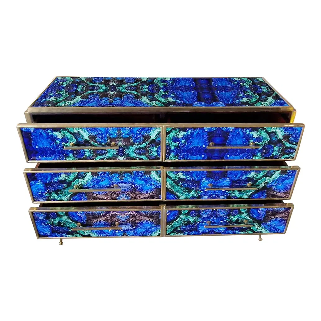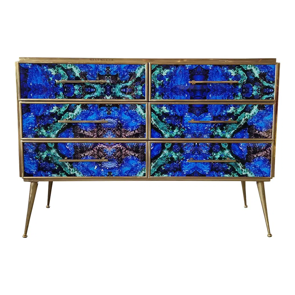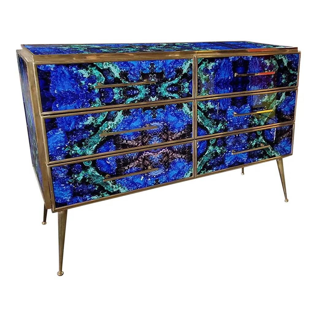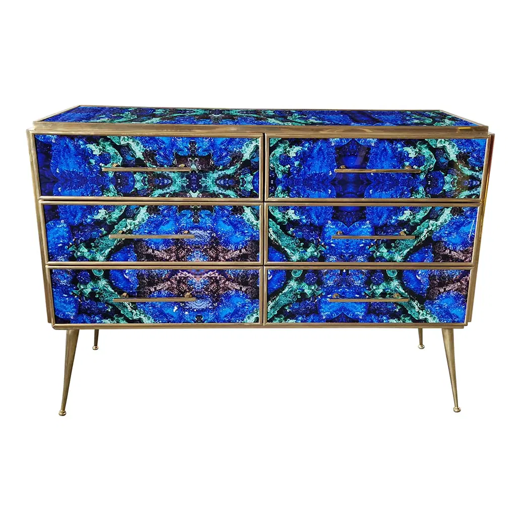 Comò in legno rivestito in vetro color lapislazzuli con sei cassetti , profili maniglie piedini in ottone.