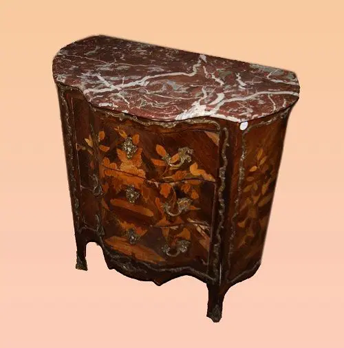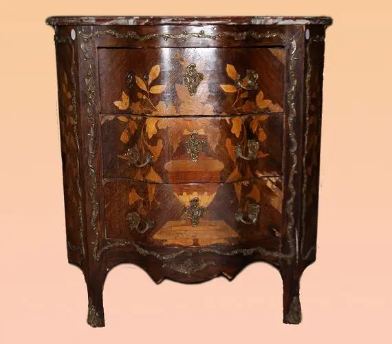 Comò comoncino 3 cassetti francese della seconda metà del 1800, stile Luigi XV, in legno di palissandro. Presenta ricche applicazioni in bronzo piano in marmo e intarsi floreali su tutta la sua superficie.