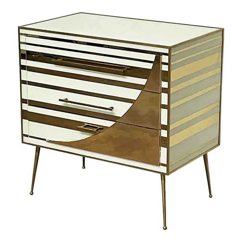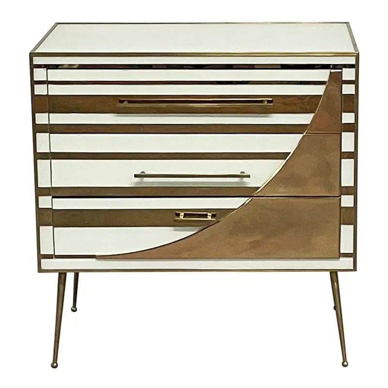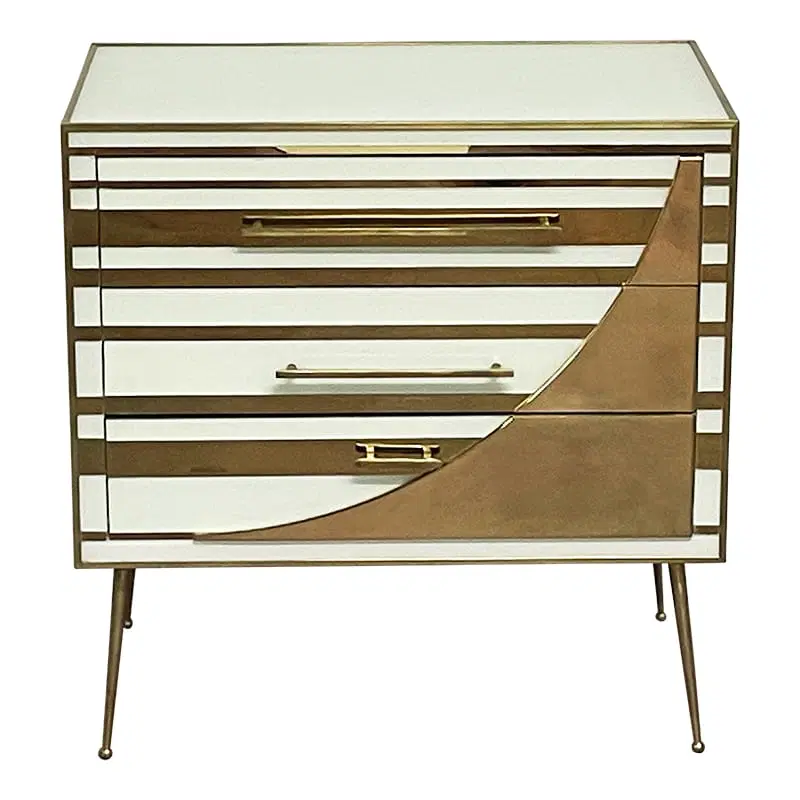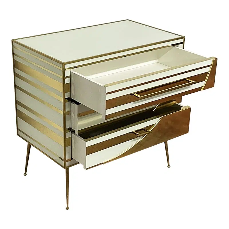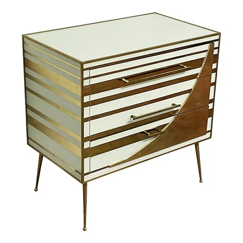 Comò a tre cassetti, interamente realizzato a mano, con struttura in legno e rivestito in vetro bianco e oro; profili, maniglie e piedi in ottone dorato.