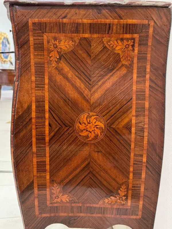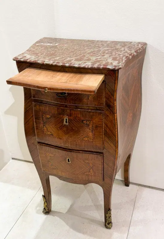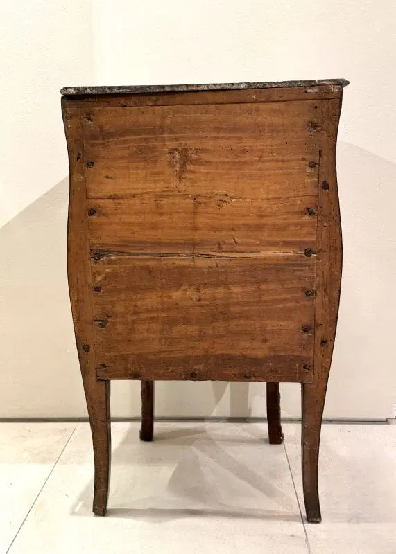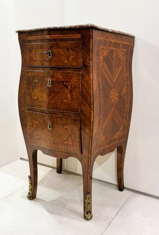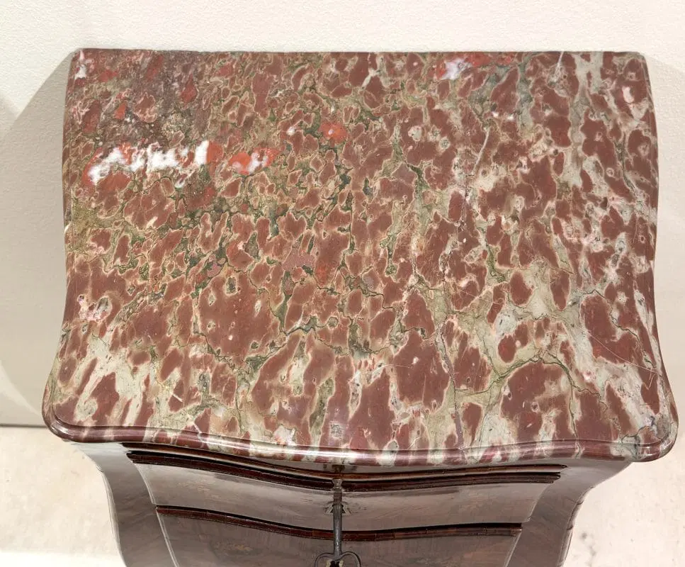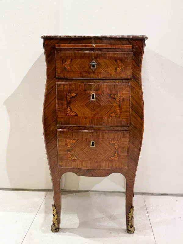 Comodino lastronato in rigatino di noce e intarsi in legno di bosso, Napoli XVIII secolo, fronte a corpo mosso a tre cassetti decorati con piccole foglie agli angoli con legni di testa e tiretto sotto il piano in marmo, piedini a scarpette in bronzo dorato cm 89x53x40