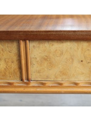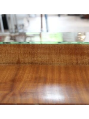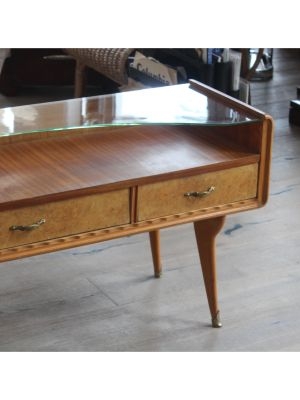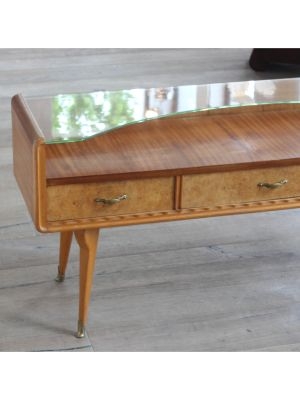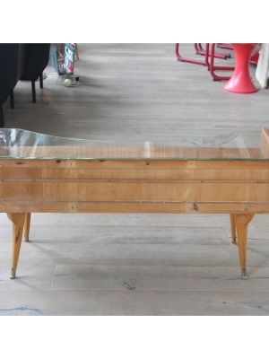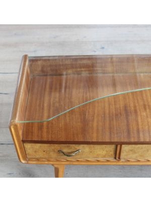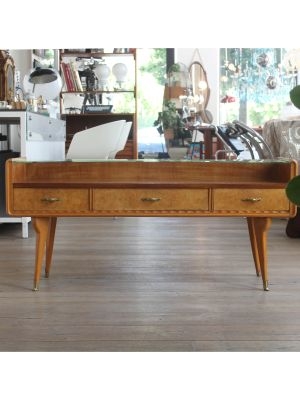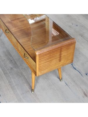 / Questa console bassa, unisce linee pulite e dettagli ricercati tipici del design anni 60. La struttura in legno biondo è arricchita da piccole cappette intarsiate alla base, mentre il piano in vetro sagomato, leggermente rialzato rispetto alla base, crea un vano elegante e funzionale, con un pizzico di teatralità, che in casa non guasta mai.