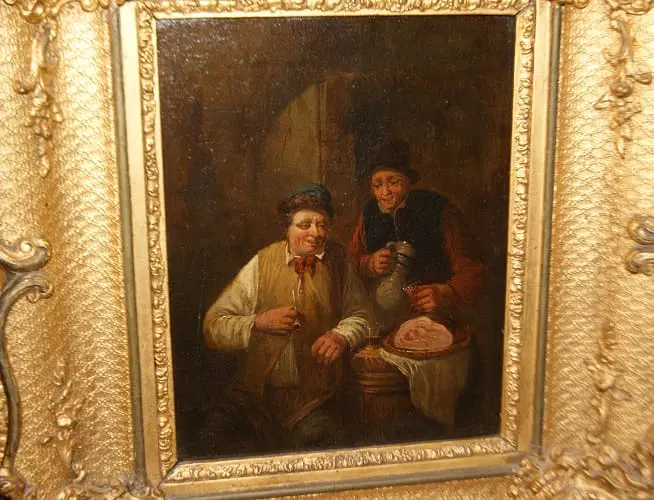 Coppia di bellissimi oli su tavola francesi del 1700 raffigurante scena di interni con personaggi ritratti mentre mangiano e bevono seduti al tavolo di una locanda. Stupende cornice coeva dorate foglia oro.