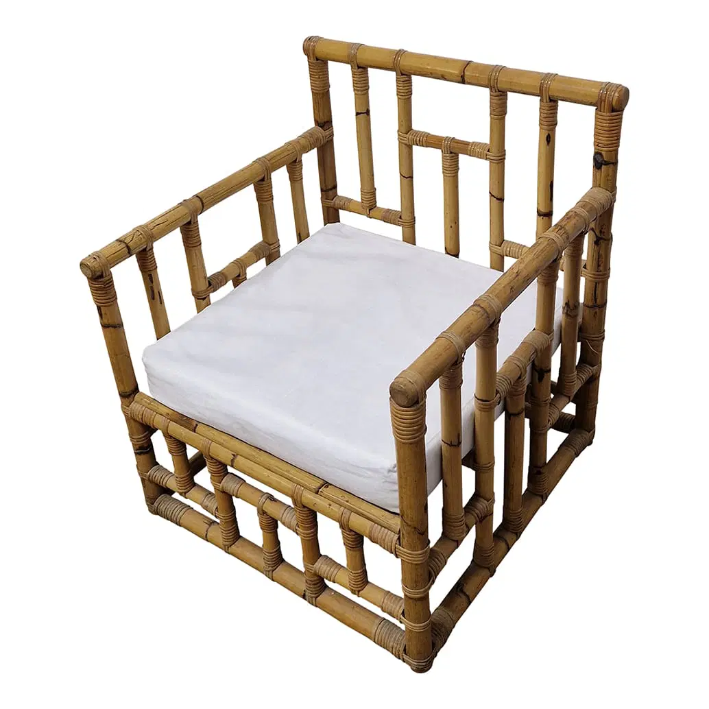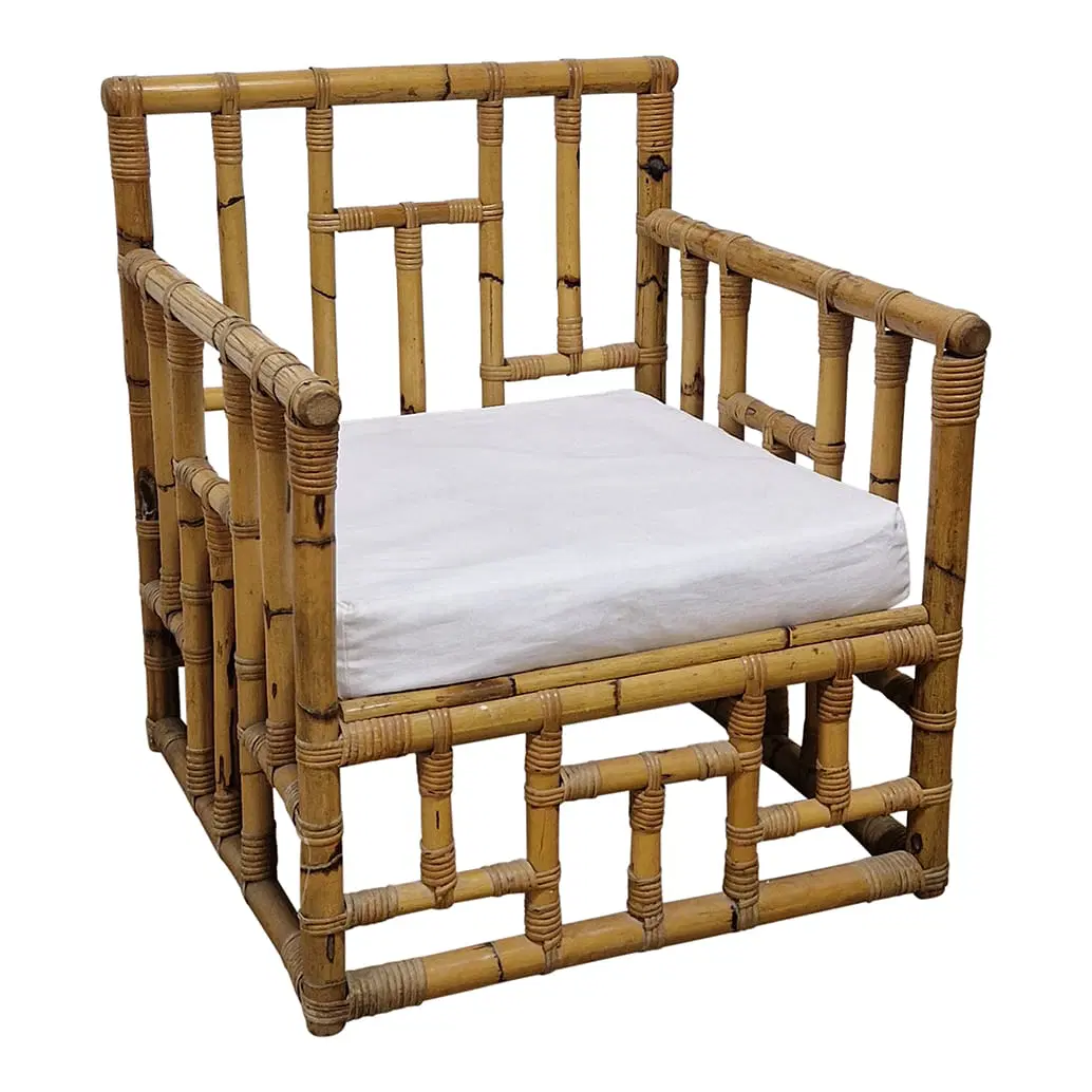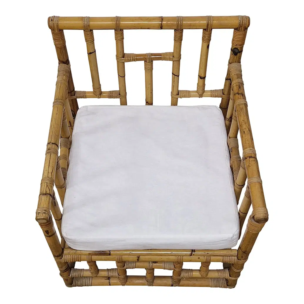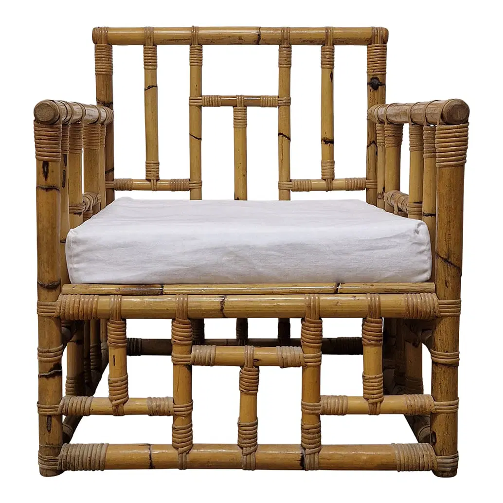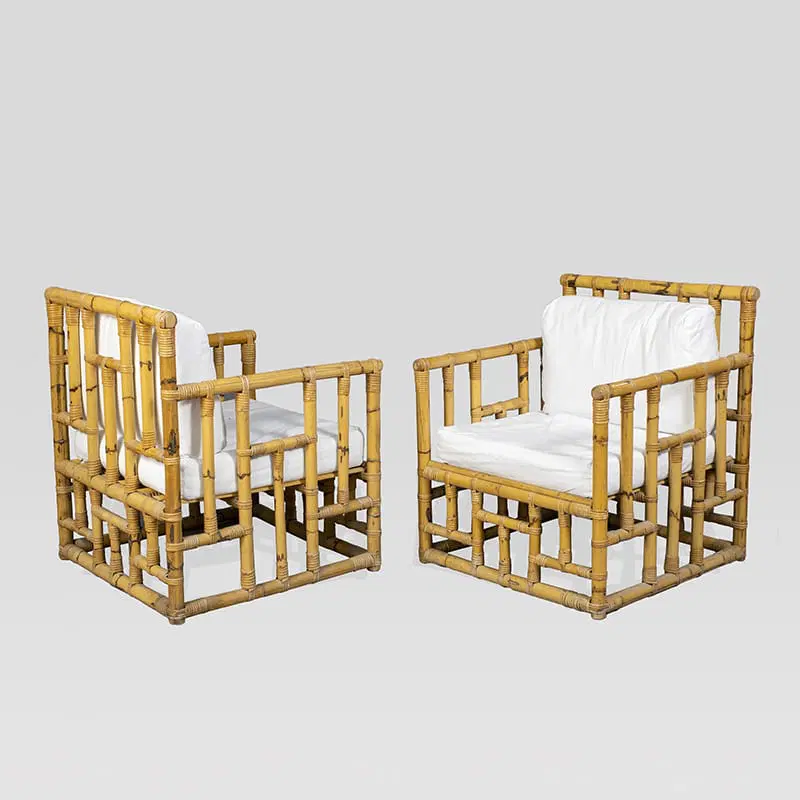 Coppia di poltrone in bambù e rattan, cuscini in tessuto imbottito.