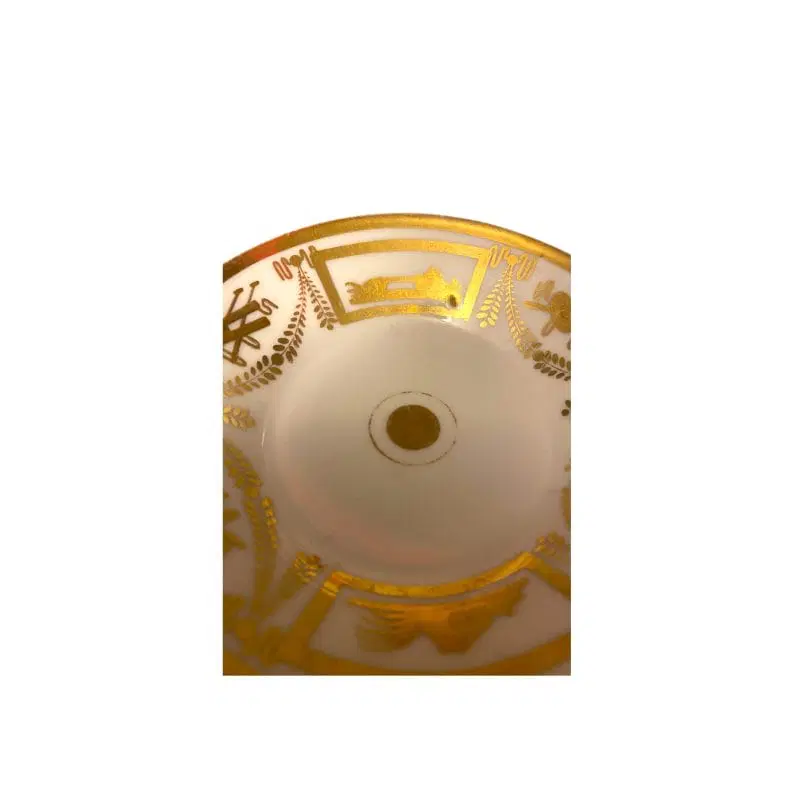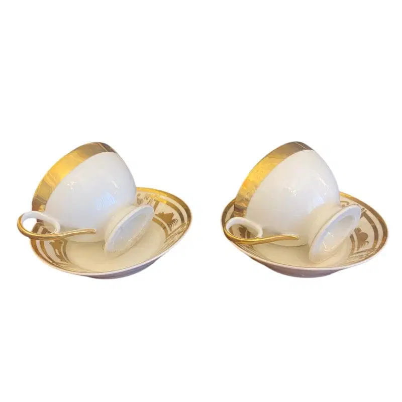 Elegante coppia di tazzine da collezione del Periodo Impero, in porcellana bianca e oro. I piattini decorati a trionfi e ghirlande.