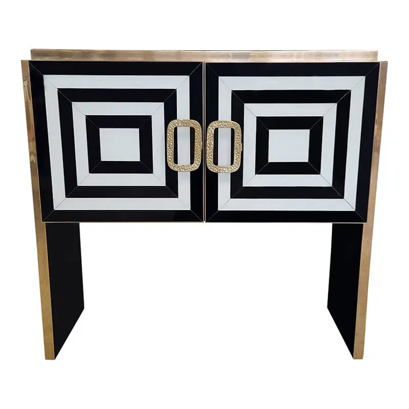 Piccola credenza interamente realizzata a mano, con due ante e un vano interno rivestito a specchio, struttura in legno rivestita in vetro nero con inserti geometrici in vetro bianco e nero sulle due ante; profili e maniglie in ottone dorato.