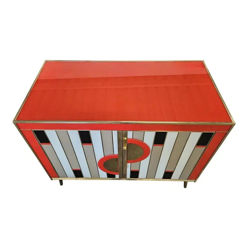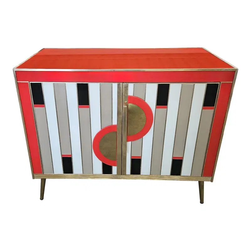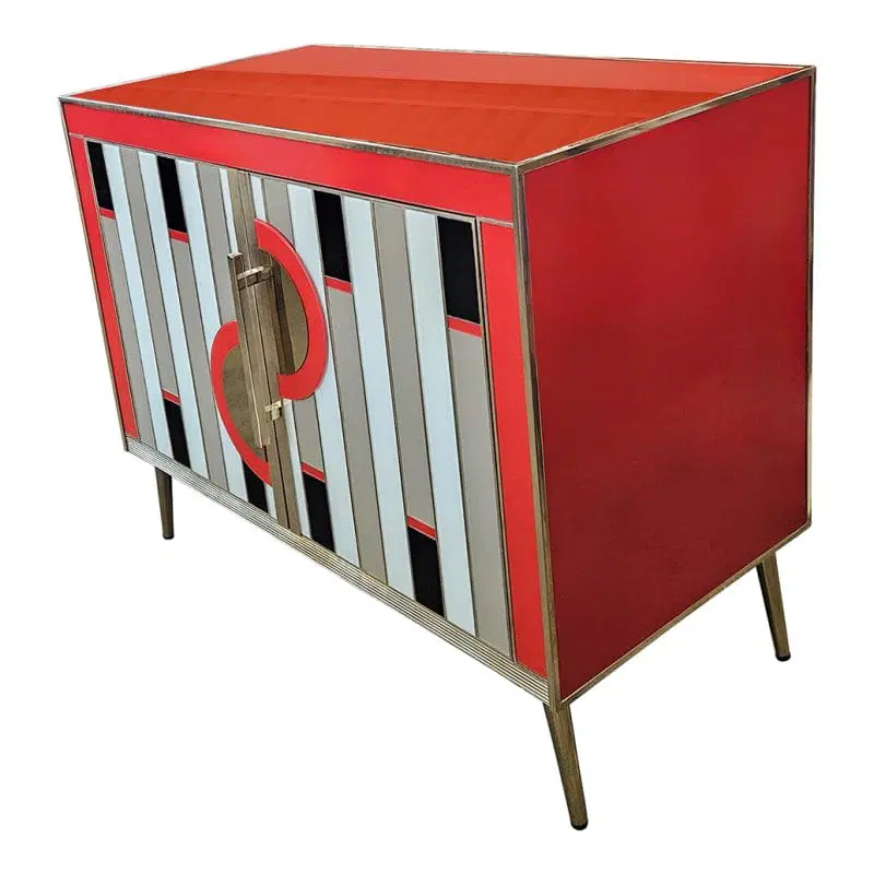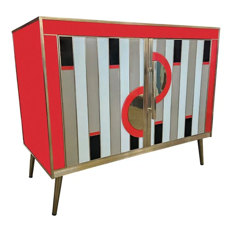 Credenza con due ante, interamente realizzata a mano, con struttura in legno e rivestita in vetro di Murano rosso, nero, grigio e bianco; arricchita con maniglie a forma di mezzaluna; profili e piedi in ottone dorato.