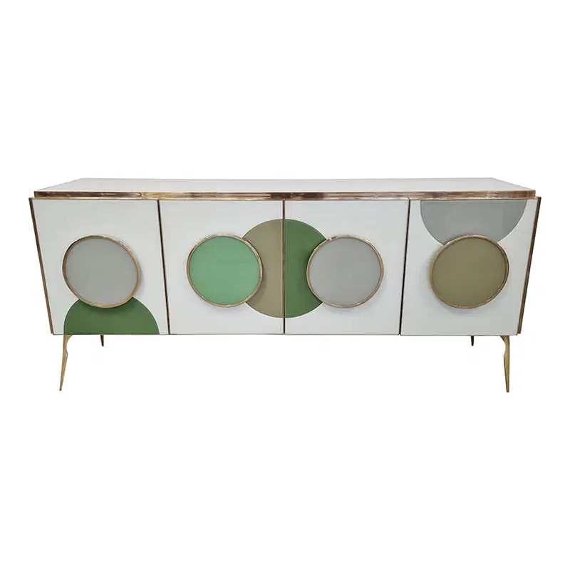 Credenza a quattro ante con ripiano interno, interamente realizzata a mano, con struttura in legno rivestita in vetro bianco. Profili e piedi in ottone dorato. Maniglie tonde colorate retroilluminate a led.