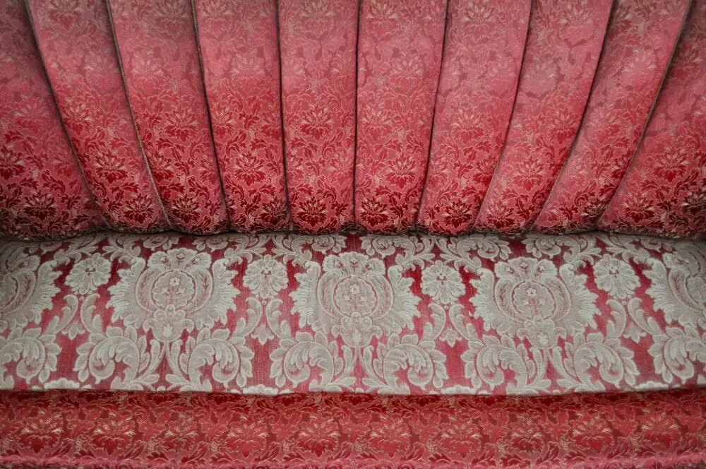 Divano con struttura in legno, piedini a vista, imbottitura velluto damascato, cuscini in appoggio con cinghie. Dettagli in corda oro