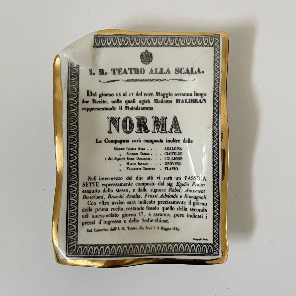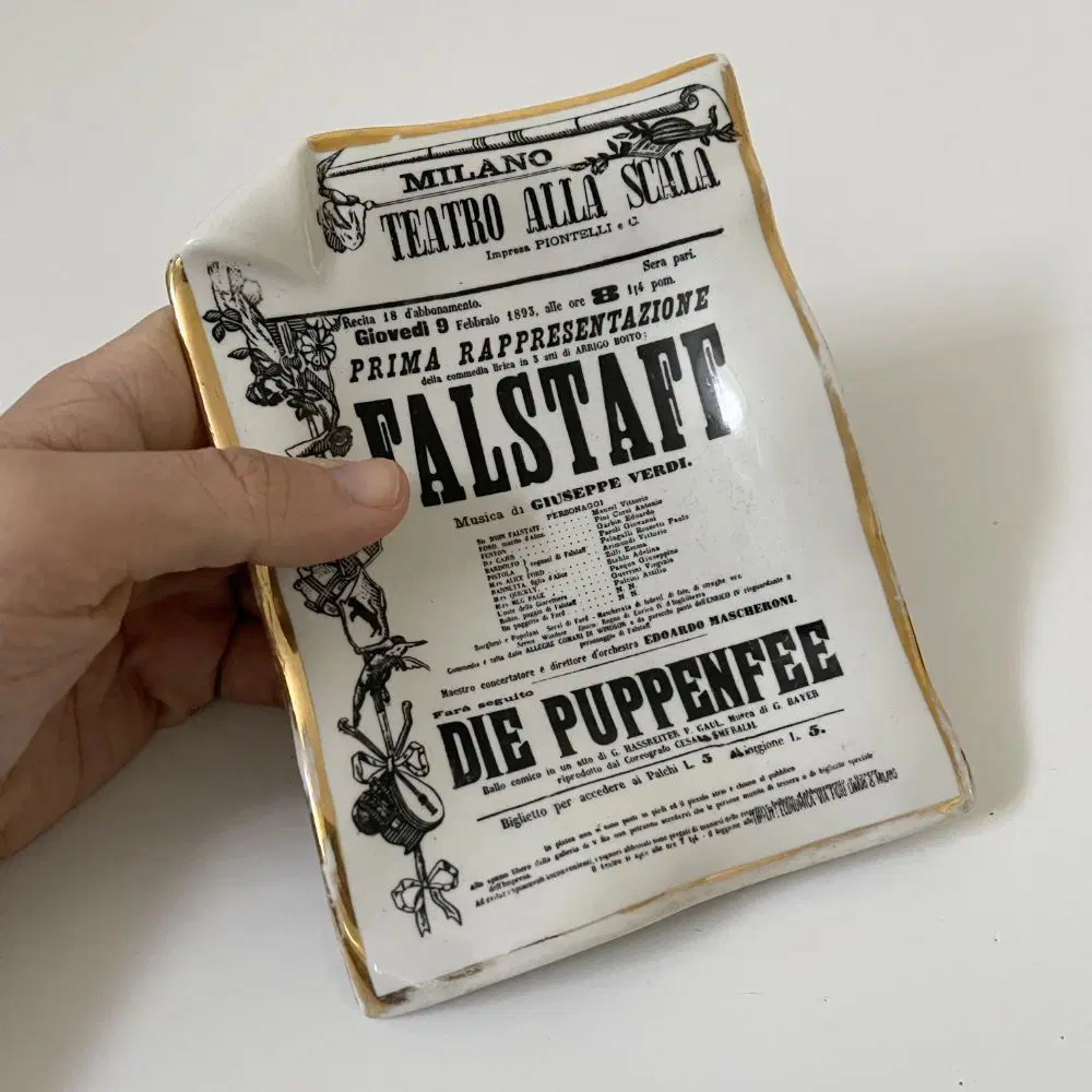 Sul retro c’è il marchio della manifattura “Fornasetti – Milano Made in Italy ” ed una informazione di carattere storico/culturale inerente le prime rappresentazione di “Falstfaff” di Giuseppe Verdi, di “Iris” di Pietro Mascagni e della “Norma” di Vincenzo Bellini.