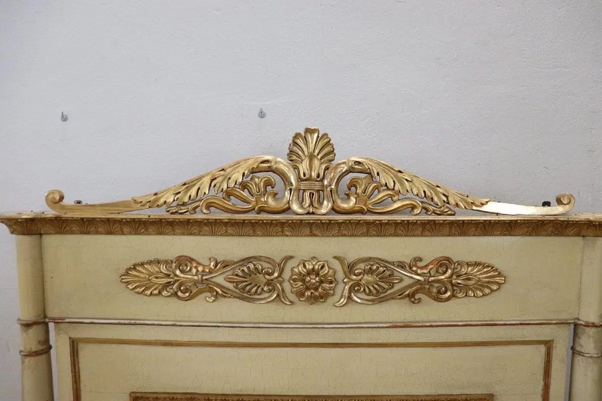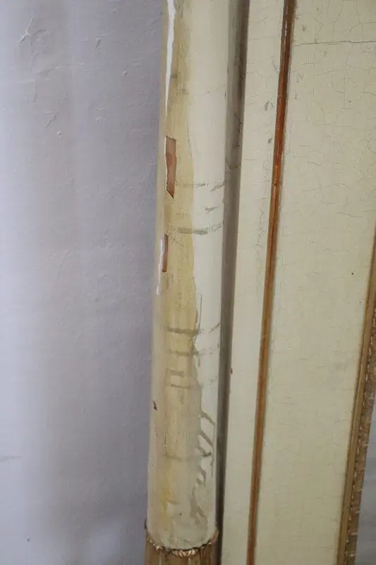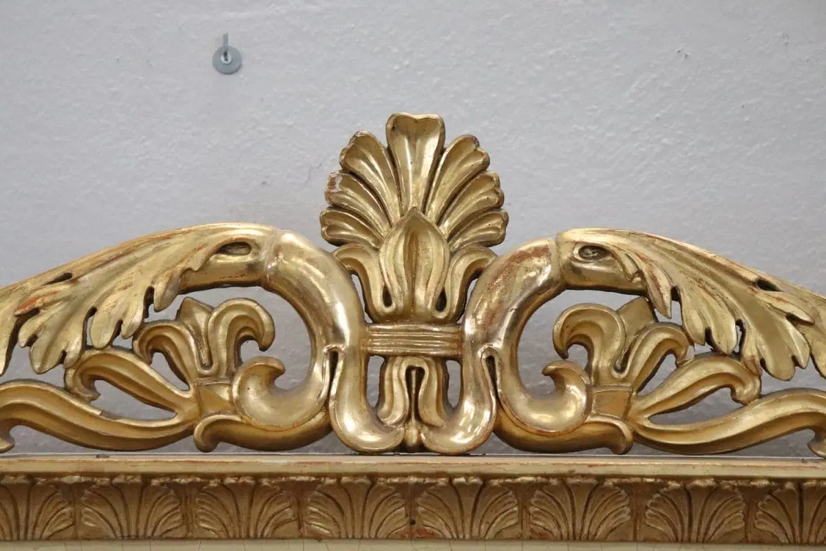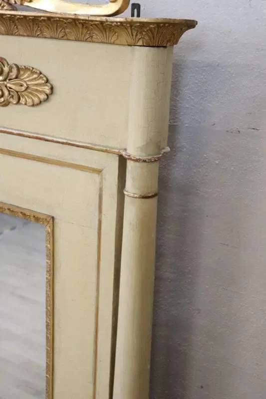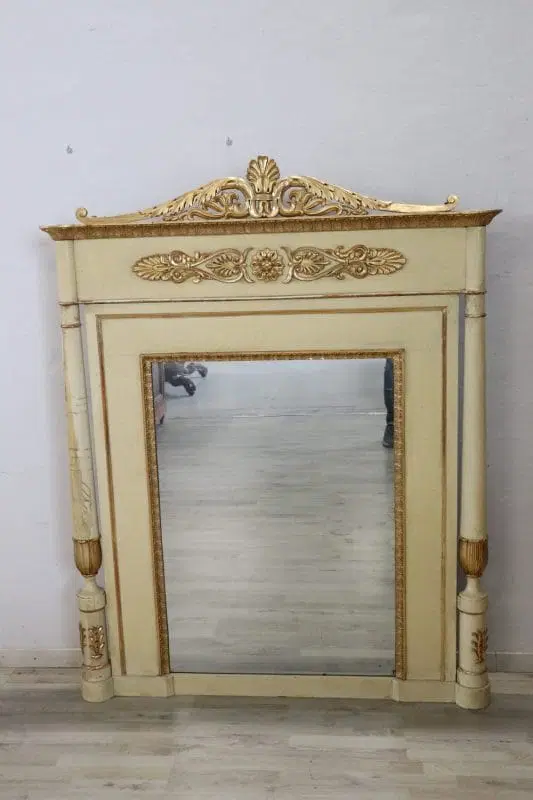 Grande specchiera da camino antica epoca Impero primi secolo XIX. Caratterizzata da due grandi colonne piene ai lati. In legno laccato con ricca decorazione dorata in foglia oro. Presenta segni di usura nella laccatura, guardare tutte le immagini in dettaglio.prezzo trattabile vi invitiamo ad inviarci le vostre proposte di acquisto le valuteremo con piacere.