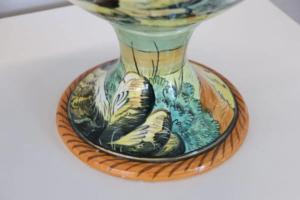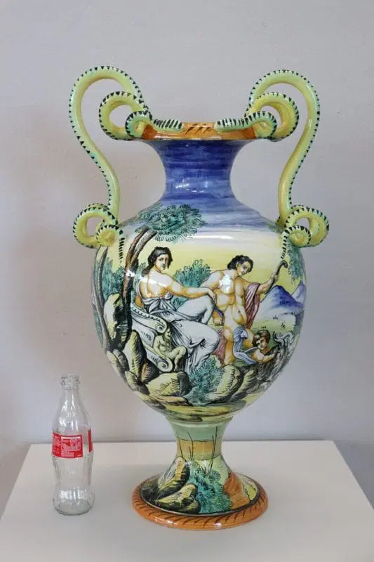 Grande vaso in maiolica produzione italiana a forma di anfora. Raffinata decorazione dipinta a mano di gusto classico con personaggi e paesaggi. Due grandi manici a forma di serpente. Marchio presente alla base. Vi consigliamo di guardare bene in dettaglio tutte le foto allegate. Proposto ad un’ottimo prezzo trattabile vi invitiamo ad inviarci le vostre proposte di acquisto le valuteremo con piacere.