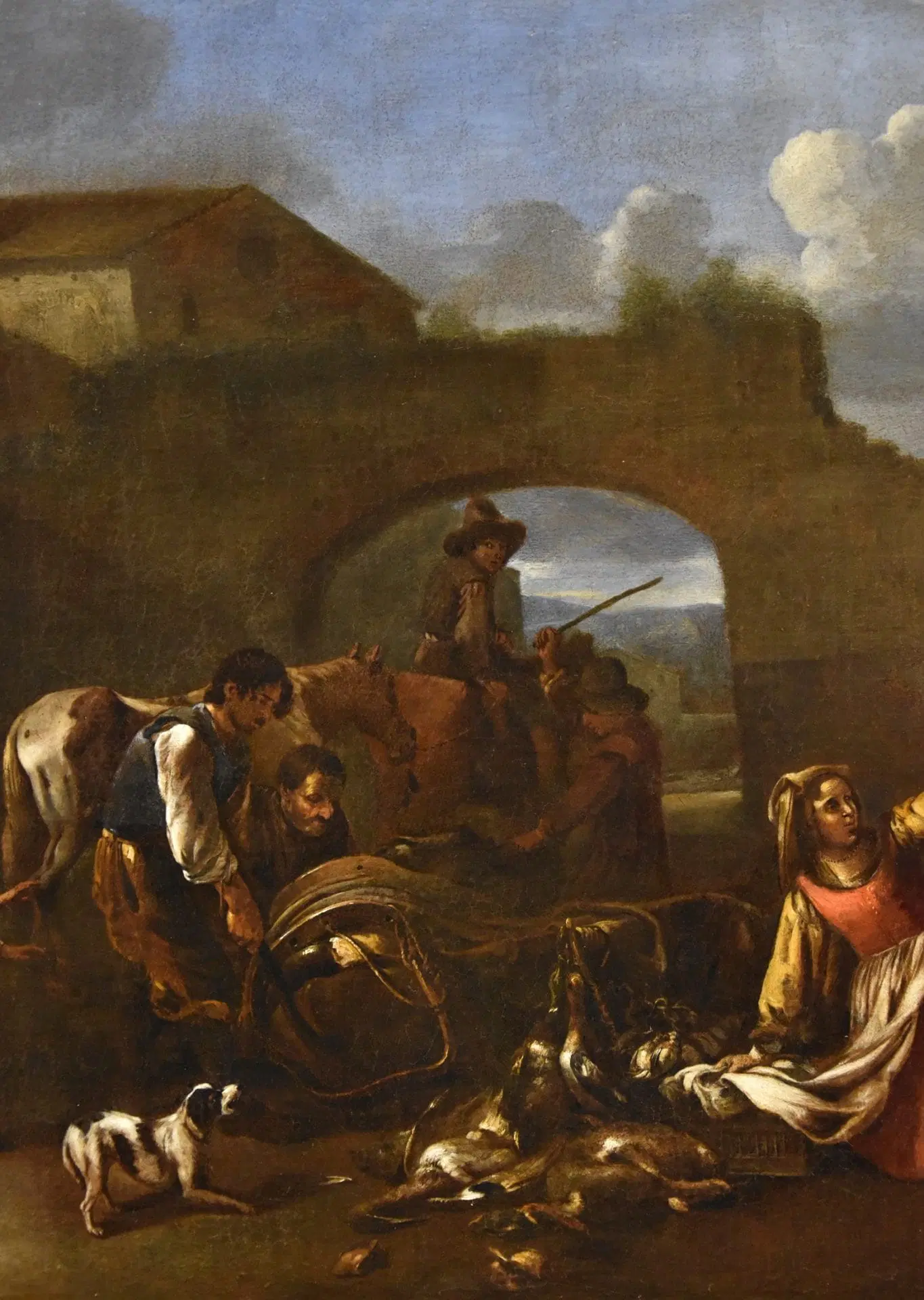 Caratteristico di questa corrente di pittori era appunto il ritrarre scene popolari di vita comune della Roma papale, rinnegando quelli che erano i canoni e i soggetti ufficiali del tempo, come possiamo ben osservare dalla nostra tela: sulla riva di un fiume in un paesaggio italiano, due uomini sono appena tornati dalla caccia e stanno disponendo a terra le prede, tra cui vari uccelli con un’anatra, un beccaccino ed un coniglio braccato. Un piccolo cane bianco e nero abbaia agli uccelli uccisi. A destra c’è una donna inginocchiata, con una veste rossa e un grembiule bianco, che lascia volare due piccioni che aveva nella cesta coperta davanti a sé, rallegrando il ragazzino seduto accanto a lei con le mani tese in aria in segno di sorpresa.
