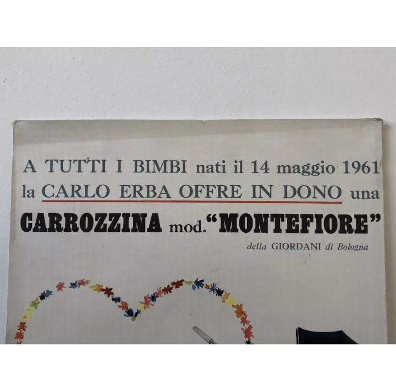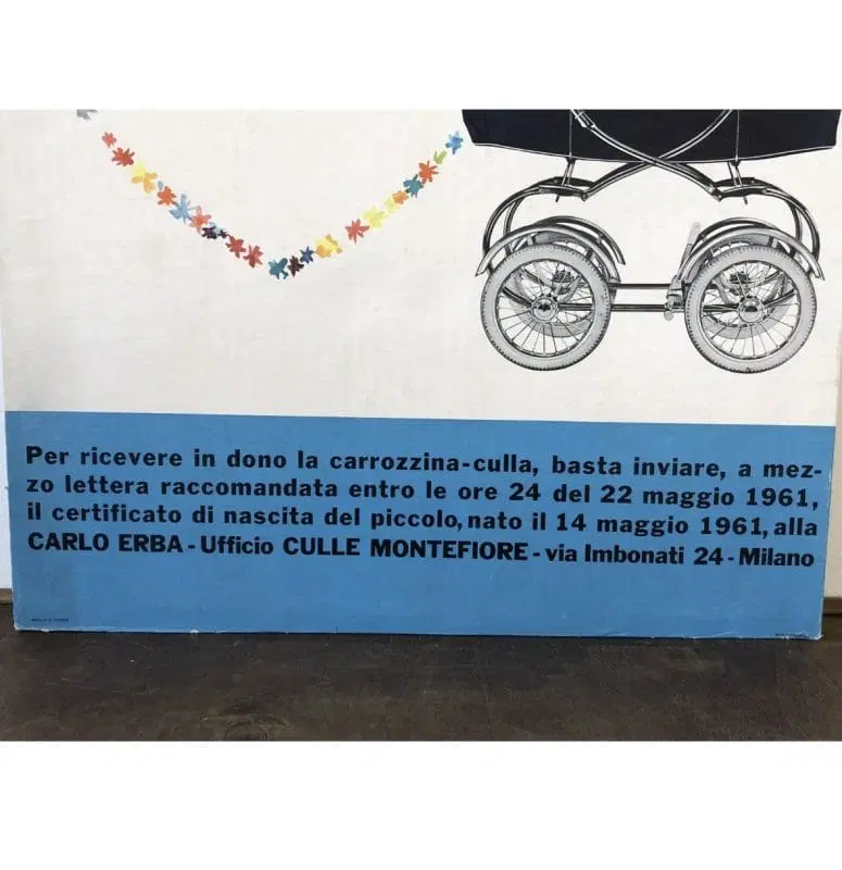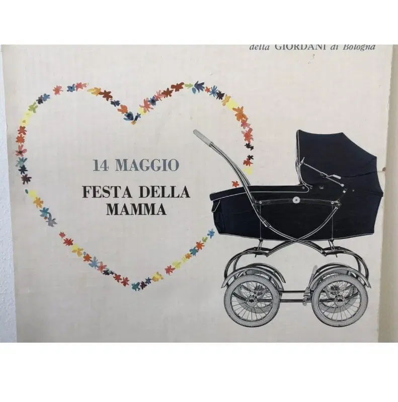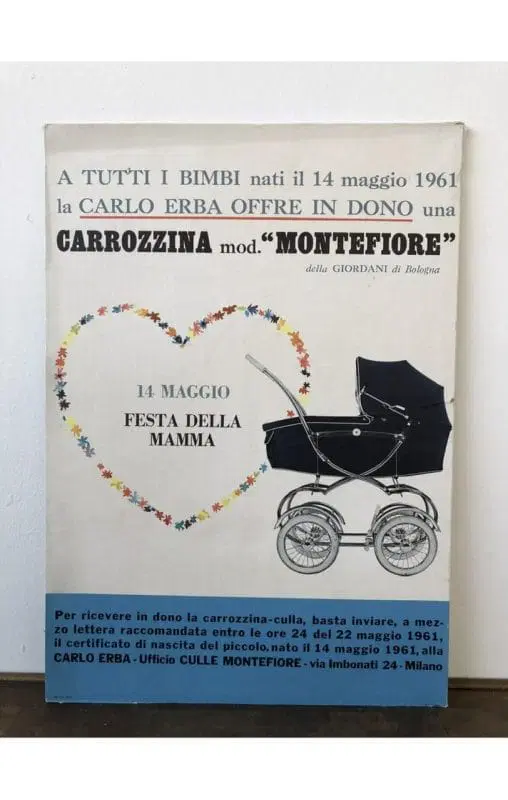 Cartoncino da banco che pubblicizza in dono una carrozzina modello Montefiore (della Giordani di Bologna) per la festa della mamma del 14 maggio 1961.
